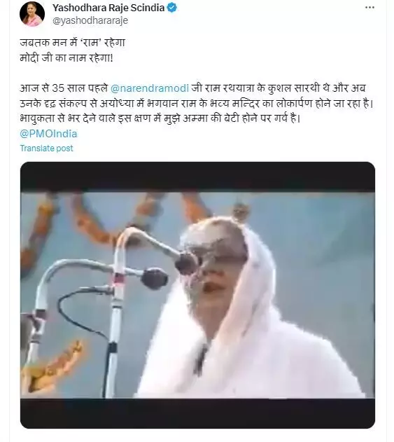 यशोधरा ने यह वीडियो तब शेयर किया है, जब अयोध्या में श्रीराम मंदिर में रामलला की प्राण प्रतिष्ठा की जोर-शोर से तैयारियां चल रही हैं। आगामी 22 जनवरी को राम मंदिर में श्री रामलला की प्राण प्रतिष्ठा होनी है। राजमाता विजयाराजे सिंधिया जनसंघ की संस्थापक सदस्य रही हैं। उन्होंने राम मंदिर की लड़ाई में महत्वपूर्ण भूमिका निभाई थी। राजमाता ने सन् 1988 में भाजपा कार्यसमिति में पहली बार राममंदिर का प्रस्ताव रखा था। उन्होंने 1992 में अयोध्या में कार सेवकों को संबोधित भी किया था।