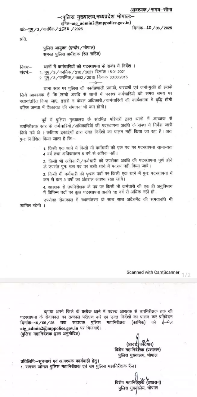पुलिस मुख्यालय ने पहला आदेश 10 जून का निकाला। जिसमें सभी पुलिस अधीक्षक, पुलिस आयुक्त एवं रेल पुलिस अधीक्षकों के नाम लिखा कि थानों में किसी भी कर्मचारी की पदस्थापना 5 साल से अधिक न हो। किसी कर्मचारी को उसी पर उसी थाने में पुन: पदस्थ न किया जाए। अलग-अलग पदों पर एक ही थाने में पदस्थापना में 3 साल का अंतर रखा जाए। एक अनुविभाग में 10 साल से ज्यादा कार्यकाल न हो। इन निर्देशों का पालन करने की समय-सीमा 16 जून थी।