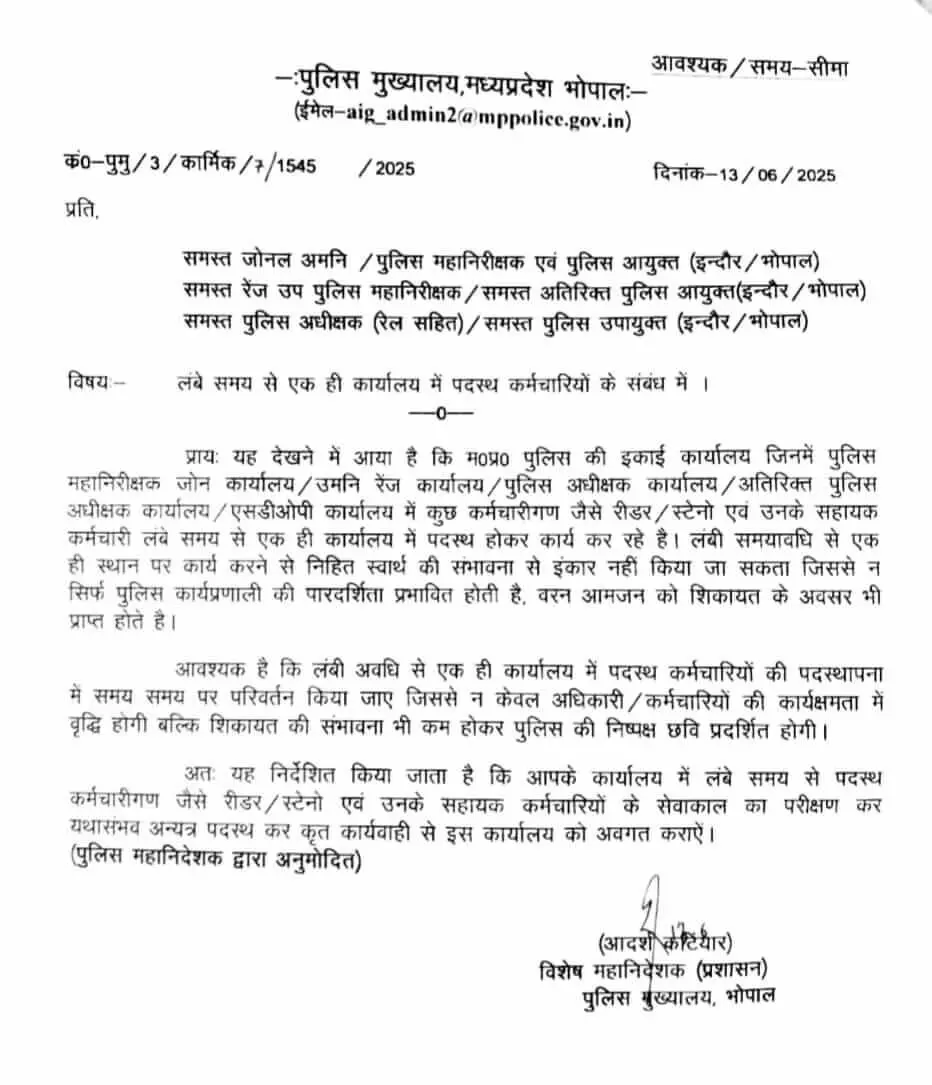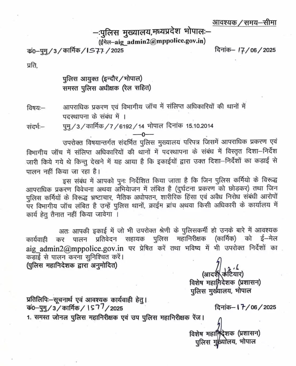 दरअसल, मुख्यमंत्री डॉ मोहन यादव ने तबादला प्रक्रिया के बीच ही पुलिस महानिदेशक कैलाश मकवाना को निर्देश दिए हैं कि जनता में पुलिस की छवि सुधारने के लिए हर संभव कदम उठाए जाएं। इसके बाद विशेष पुलिस महानिदेशक प्रशासन आदर्श कटियार ने 10 जून, 13 एवं 17 जून को सभी पुलिस अधीक्षक, रेल पुलिस अधीक्षक, पुलिस आयुक्त एवं अन्य कार्यालय प्रमुखों के नाम निर्देश पत्र जारी किएैं। खास बात यह है कि इन पत्रों पर इतनी तेजी से अमल होता दिखाई दे रहा है, जो पिछले 20-25 साल में कभी नहीं हुआ।