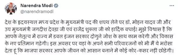 शपथ ग्रहण समारोह के बाद प्रधानमंत्री मोदी ने सोशल मीडिया एक्स के माध्यम से कहा कि देश के हृदयस्थल मध्य प्रदेश के मुख्यमंत्री पद की शपथ लेने पर डॉ. मोहन यादव और उप मुख्यमंत्री जगदीश देवड़ा एवं राजेंद्र शुक्ला को हार्दिक बधाई। मुझे विश्वास है कि आपके नेतृत्व में राज्य में डबल इंजन सरकार दोगुने जोश के साथ काम कर विकास के नए प्रतिमान गढ़ेगी। इस अवसर पर यहां के अपने सभी परिवारजनों को भी मैं यह भरोसा देता हूं कि भाजपा सरकार आपके जीवन को आसान बनाने में कोई कोर-कसर नहीं छोड़ेगी।