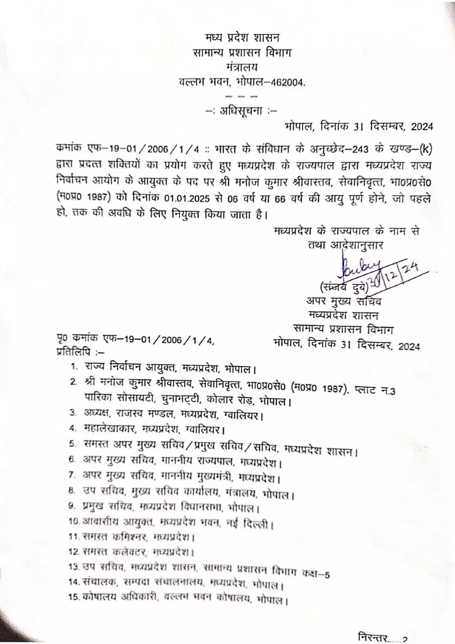 |MP News: पूर्व आईएएस अधिकारी मनोज श्रीवास्तव को प्रदेश का नया राज्य निर्वाचन आयुक्त नियुक्त किया गया है। वह 1 जनवरी से अपना कार्यभार संभालेंगे। वर्तमान में श्रीवास्तव प्रशासनिक इकाई पुनर्गठन आयोग के सदस्य थे और उन्होंने मंगलवार को इस पद से इस्तीफा दे दिया। सामान्य प्रशासन विभाग ने उनकी नियुक्ति का आदेश जारी कर दिया है। आदेश के अनुसार, श्रीवास्तव की नियुक्ति छह वर्ष या 66 वर्ष की आयु पूरी होने तक, जो भी पहले हो, वैध रहेगी।