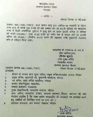 सामान्य प्रशासन विभाग द्वारा जारी आदेश के अनुसार कोरोना महामारी के दौरान अन्य राज्यों से अपने मूल राज्य में जाते समय यदि किसी मजदूर की मध्यप्रदेश में किसी आकस्मिक दुर्घटना में मृत्यु हो जाती है तो उस स्थिति में राज्य शासन मृतक प्रवासी श्रमिक के परिवार को एक लाख रूपये एवं गंभीर रूप से घायल होने पर प्रवासी श्रमिक को 25 हजार रुपये की सहायता राशि मुख्यमंत्री सहायता कोष से स्वीकृत करेगा।