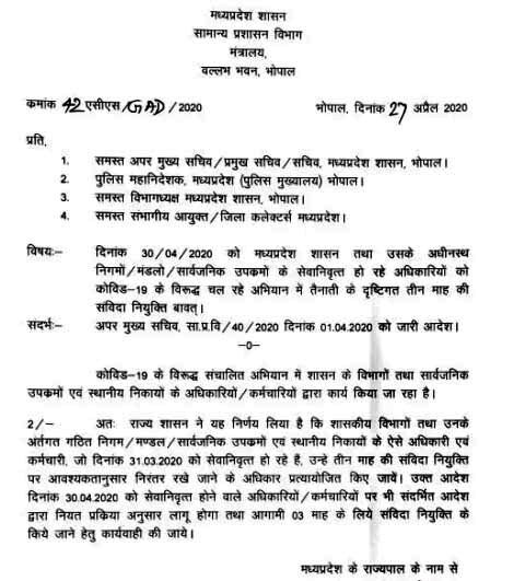 सरकार द्वारा जारी आदेश अनुसार शासकीय विभागों तथा उनके अंतर्गठित निगम/मंडल/सार्वजानिक उपक्रमों एवं स्थानीय निकायों के ऐसे अधिकारी और कर्मचारी जो 31 मार्च को सेवानिवृत्त हो रहे हैं, उन्हें तीन माह की संविदा नियुक्ति पर आवश्यकतानुसार निरंतर रखा जाएगा। यह आदेश 30 अप्रैल 2020 को सेवानिवृत्त होने वाले अधिकारियों कर्मचारियों पर भी यह लागू होगा।