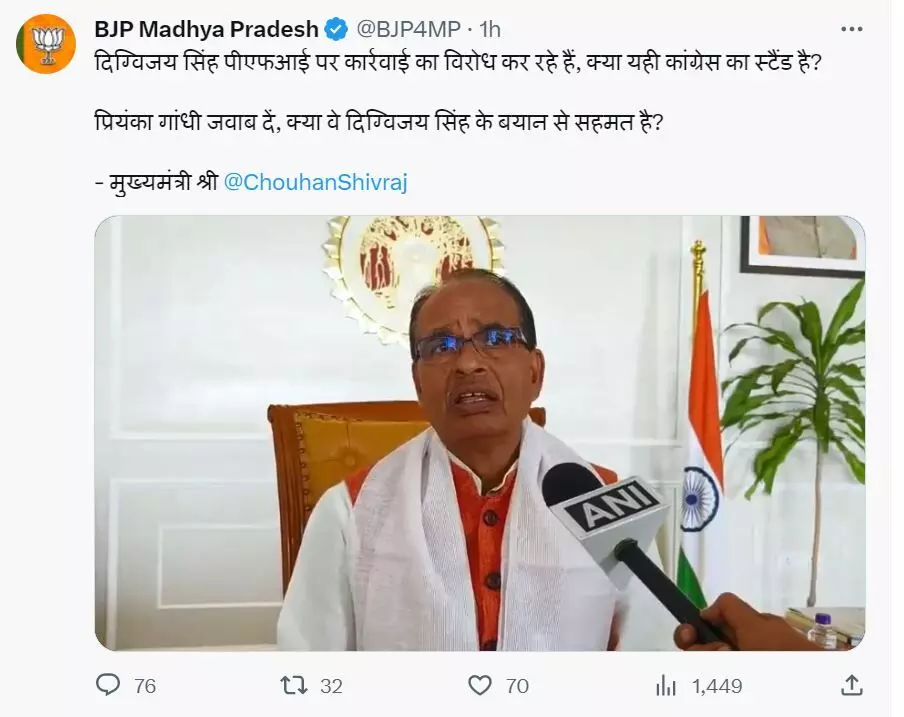 शिवराज सिंह ने प्रियंका गांधी से पूछे सवाल, क्या कांग्रेस PFI पर कार्रवाई का विरोध कर रही है ?