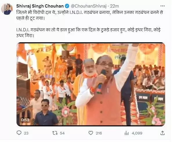 मुख्यमंत्री चौहान ने शुक्रवार को ट्वीट के माध्यम से कहा कि अखिलेश यादव ने बताया है कि कांग्रेस ने उन्हें और सपा को एक साल तक धोखे में रखा। बातें करते रहे और बाद में धोखा दे दिया। उनके कार्यकर्ता रातभर जागे, उन्हें बैठाया। उन्होंने चिरकुट जैसे जिन शब्दों का प्रयोग किया है, इससे उनके मन की स्थिति समझी जा सकती है कि कांग्रेस ने कितना धोखा दिया है। चौहान ने कहा कि जिस दिन आईएनडीआईए गठबंधन बना था, हमने कह दिया था कि यह बेमेल गठबंधन है, इनमें न लोगों के विचार एक हैं और न दिल एक हैं। केवल प्रधानमंत्री मोदी की लोकप्रियता से घबरा कर यह बेमेल गठबंधन बना था, जो बनने के पहले ही टूट रहा है।