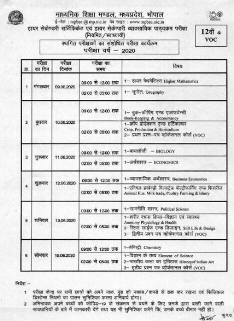 |भोपाल। लॉकडाउन की वजह से स्थगित हुई एमपी बोर्ड की 12 वीं कक्षा की परीक्षा का टाइम टेबल आज घोषित हो गया। ये परीक्षा 9 जून से शुरू होकर 15 जून तक चलेंगी। मुख्यमंत्री चौहान ने हाल ही में कुछ समय पहले घोषणा की थी की 12 विन की परीक्षाएं लॉकडाउन के बाद जून माह में होंगी। जबकि 10 वीं की शेष परीक्षाओं को स्थगित कर विद्यार्थियों को जनरल प्रमोशन दे दिया गया है। इसी क्रम में आज मप्र माध्यमिक शिक्षा मंडल ने 12 वीं की शेष परीक्षाओं की तारीखों की घोषणा की है।