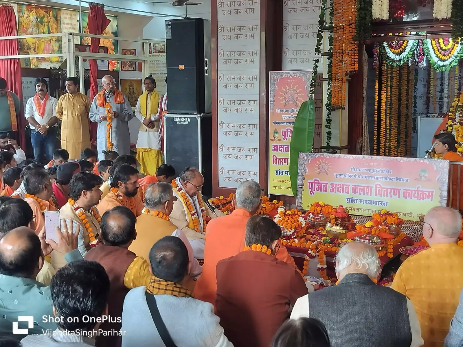 5 नवंबर को श्री राम मंदिर में पूजित अक्षत (पीले चावल) कलश संगठन की दृष्टि से बने हमारे मध्यभारत प्रान्त आ चुके हैं। इन पूजित अक्षत कलश का जिला सह वितरण कार्यक्रम गुफा मंदिर ,लालघाटी भोपाल मैं रखा गया जिसमे पूज्य साध्वी महामंडलेश्वर प्रज्ञा भारती दीदी , महंत श्री रामदास त्यागी जी महाराज, महंत श्री अनिलानंद जी महाराज ,महामंडलेश्वर राम भूषण दास जी महाराज ,महंत श्री राधा मोहन दास जी महाराज, महंत श्री रविन्द्र दास जी महाराज , श्री सुदेश शांडिल्य जी महाराज ,विहिप केंद्रीय उपाध्यक्ष श्री हुकुमचंद सावला, संघ के प्रांत संघचालक श्री अशोक जी पांडे , विहिप प्रांत अध्यक्ष श्री पीतांबर राजदेव , प्रान्त कार्याध्यक्ष श्री के एल शर्मा , प्रान्त मंत्री श्री राजेश जैन एवम संघ परिवार के अन्य संगठनों के प्रमुख पदाधिकारी, समाज के गणमान्य नागरिक के साथ संगठन के 32 जिलों के प्रतिनिधि पूजित अक्षत कलश अपने जिलों मैं ले जाने के लिये उपस्थित रहे ।