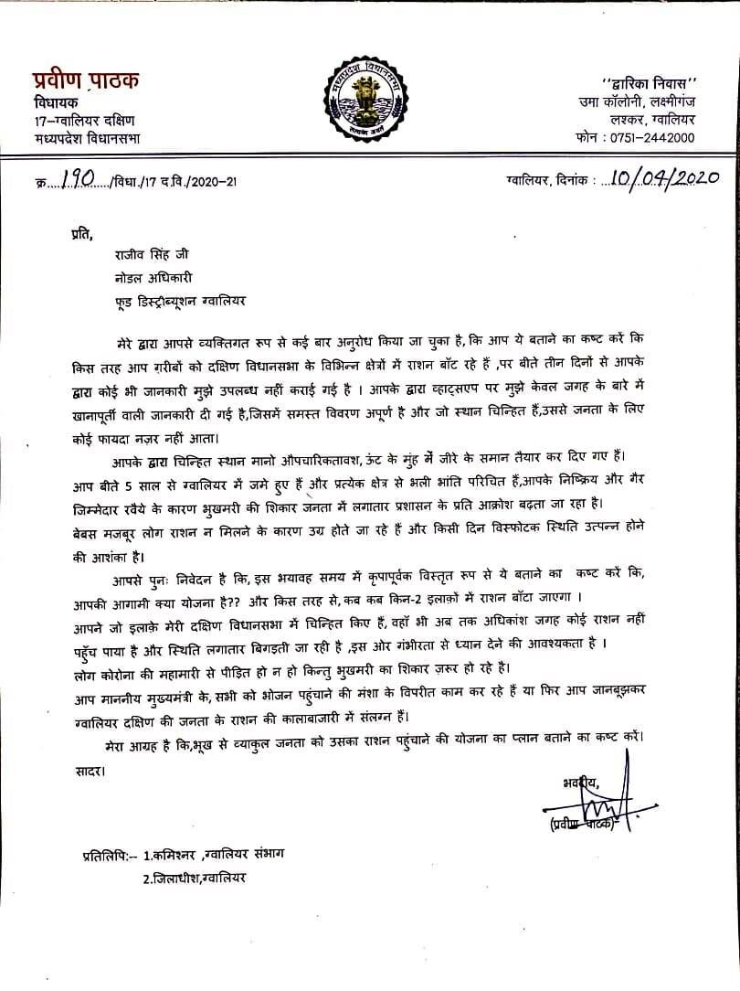 ग्वालियर : विधायक पाठक ने गरीबों को राशन दिलाने पत्र लिखकर अधिकारियों से पूछा फूड डिस्ट्रीब्यूशन प्लान