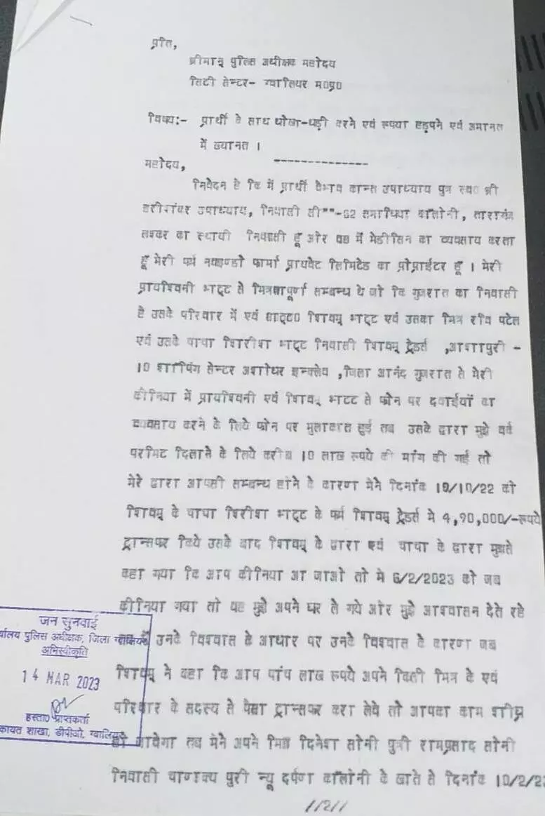 |ग्वालियर। गुजरात में रहने वाले दो भाइयों ने ग्वालियर के दवा विक्रेता से केन्या का वर्क परमिट दिलाने के नाम पर करीब 10 लाख रूपए ठग लिए। मामले का खुलासा पीड़ित के एसपी ऑफिस में जनसुनवाई में अपील के बाद सामने आया। मामला सामने आने के बाद एसपी ने मामले की जांच करने के आदेश दे दिए है।