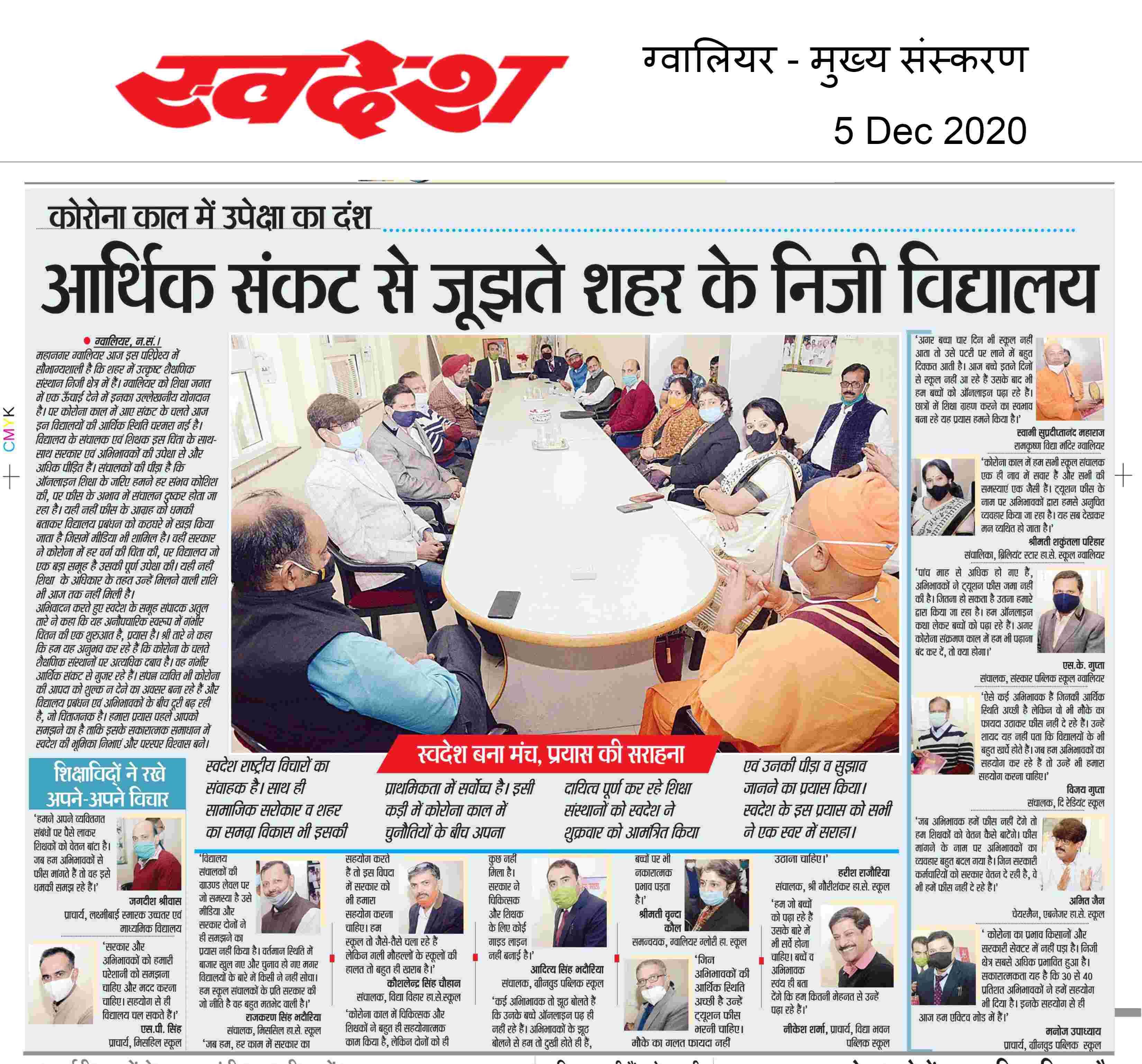 स्वदेश राष्ट्रीय विचारों का संवाहक है। साथ ही सामाजिक सरोकार व शहर का समग्र विकास भी इसकी प्राथमिकता में सर्वोच्च है। इसी कड़ी में कोरोना काल में चुनौतियों के बीच अपना दायित्व पूर्ण कर रहे शिक्षा संस्थानों को स्वदेश ने शुक्रवार को आमंत्रित किया एवं उनकी पीड़ा व सुझाव जानने का प्रयास किया। स्वदेश के इस प्रयास को सभी ने एक स्वर में सराहा।