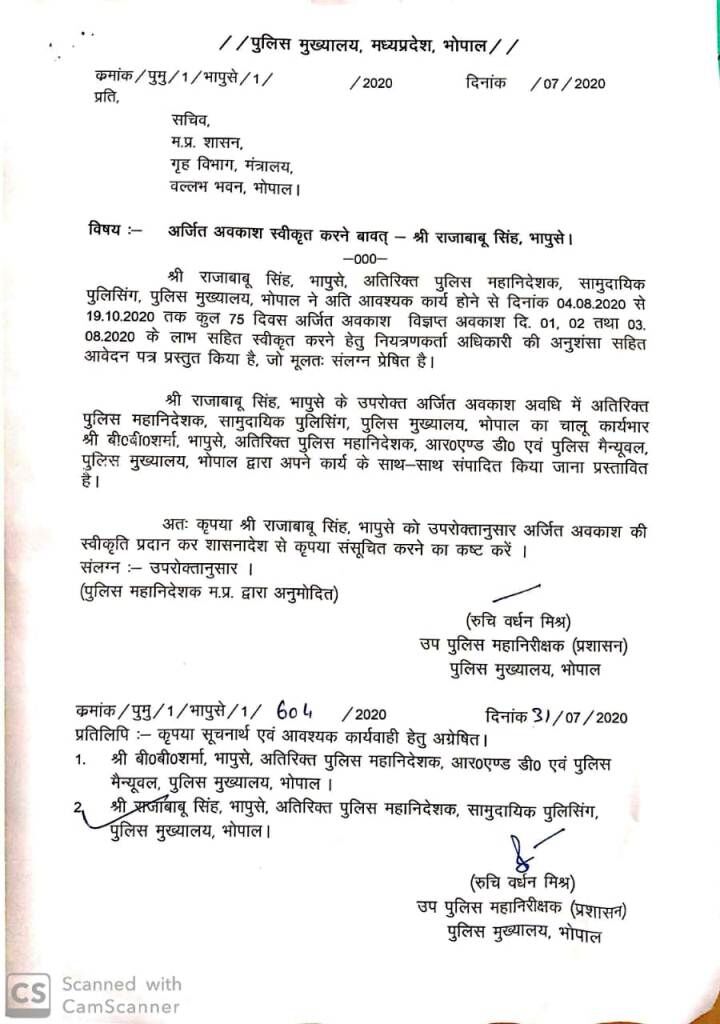 ग्वालियर। एडीजी सामुदायिक पुलिसिंग राजाबाबूसिंह ने 75 दिन का अवकाश लिया है। गृह मंत्रालय ने आदेश जारी कर उनके अवकाश के आवरदान को स्वीकृत कर लिया है। वह 4 अगस्त से 19 अक्टूबर 2020 तक अवकाश पर रहेंगे। इस दौरान उनका कार्यभार एडीजी बीबी शर्मा आर एन्ड डी एवं पुलिस मेनुअल को उनका कार्यभार सौपा गया है। बता दें की एडीजी राजा बाबू सिंह का हाल ही में ग्वालियर रेंज से ट्रांसफर कर सामुदायिक पुलिसिंग भोपाल कर दिया गया है।