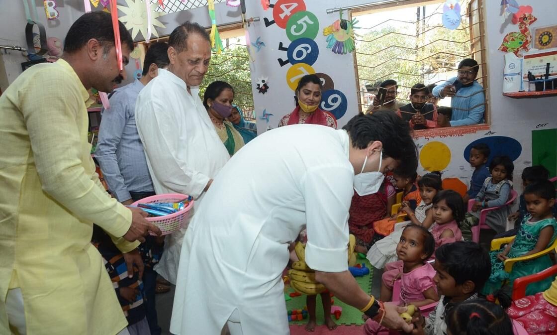 उड्डयन मंत्री सिंधिया पहुंचे आंगनबाड़ी, फल व मिठाई बाँटकर बच्चों का किया उत्साहवर्धन