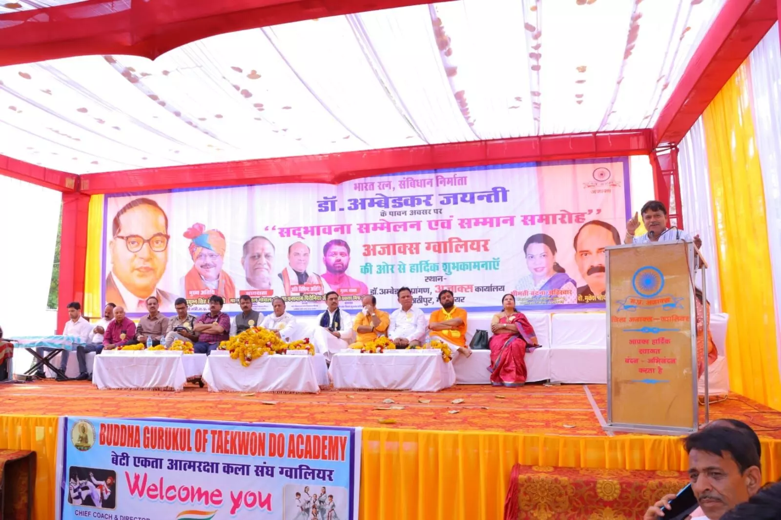 शुक्रवार को ठाठीपुर स्थित अजाक्स अनुसूचित जाति–अनुसूचित जनजाति अधिकारी एवं कर्मचारी संघ कार्यालय परिसर में डॉ. भीमराव अम्बेडकर की जयंती समारोहपूर्वक मनाई गई। इस अवसर पर चिकित्सकों, शिक्षाविद्, समाजसेवियों एवं उत्कृष्ट कार्य करने वाले अधिकारियों व कर्मचारियों को अतिथियों ने अजाक्स की ओर से सम्मानित किया। साथ ही अन्य प्रतियोगिता के विजेता बच्चों को भी प्रमाण-पत्र प्रदान किए। कार्यक्रम में बांस निगम के अध्यक्ष घनश्याम पिरोनिया, चेम्बर ऑफ कॉमर्स के अध्यक्ष प्रवीण अग्रवाल, मुख्य वक्ता डॉ प्रकाश मिश्र, आशीष प्रताप राठौर, कलेक्टर अक्षय कुमार सिंह, पुलिस अधीक्षक राजेश चंदेल सहित कार्यक्रम संयोजक अजाक्स के जिलाध्यक्ष मुकेश मौर्य एवं महिला जिलाध्यक्ष श्रीमती वंदना अहिरवार मंचासीन थे। ऊर्जा मंत्री तोमर ने सद्भावना सम्मेलन एवं सम्मान समारोह को संबोधित करते हुए कहा कि महापुरुषों का संघर्ष, उनके आदर्श विचार एव उनके ऐतिहासिक कार्यो को समस्त समाज के समक्ष उल्लेख व उनके पदचिन्हों पर चलकर आदर्श स्थापित करना ही महापुरुषों के प्रति सच्ची निष्ठा है। यदि हम सहज भाव से बाबा साहब द्वारा बताई गईं बातों का अनुशरण करें तो सभी का कल्याण होगा। साथ ही यह बाबा साहब के प्रति सभी की सच्ची श्रद्धांजलि भी होगी। इसके साथ ही 16 अप्रैल को मेला मैदान में आयोजित होने वाले डॉ अम्बेडकर महाकुंभ के लिए सभी को बढ़ चढ़कर हिस्सा लेने के लिए आग्रह किया।