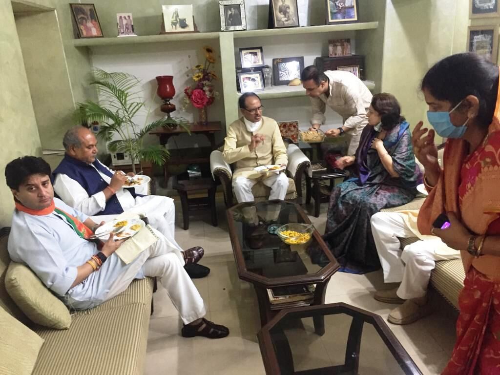 |ग्वालियर। ग्वालियर प्रवास के तीसरे दिन सोमवार को प्रदेश के मुख्यमंत्री शिवराज सिंह चौहान, केन्द्रीय मंत्री नरेन्द्र सिंह तोमर, राज्यसभा सदस्य ज्योतिरादित्य सिंधिया ने सुबह पूर्व मंत्री श्रीमती माया सिंह एवं ध्यानेन्द्र सिंह के आवास रानी महल पहुंचे। यहां पर नेताओं ने नाश्ता किया। पूर्व मंत्री श्रीमती माया सिंह एवं उनके सुपुत्र पीताम्बर प्रताप सिंह ने मुख्यमंत्री, केन्द्रीय मंत्री व राज्यसभा सदस्य को स्वयं अपने हाथों से नाश्ता परोसकर खिलाया। यह नेता करीब एक घंटे तक रानी महल में रुके और इस बीच राजनीतिक चर्चा होती रही। पूर्व मंत्रीद्वय ने मुख्यमंत्री व अन्य नेताओं का स्वागत किया। राजनीतिक चर्चाओं के बीच ठहाके भी लगते रहे। स्वल्पाहार के बाद बाहर निकले मुख्यमंत्री शिवराज सिंह चौहान व राज्यसभा सांसद ज्योतिरादित्य सिंधिया पार्टी कार्यकर्ताओं व आमजन से भी मुलाकात की। इस अवसर पर ऊर्जा मंत्री प्रद्युम्न सिंह तोमर, महिला एवं बाल विकास मंत्री श्रीमती इमरती देवी, पूर्व विधायक मुन्नालाल गोयल भी उपस्थित रहे।