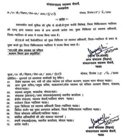 कोरोना संकट के बीच ग्वालियर सीएमएचओ बदलें