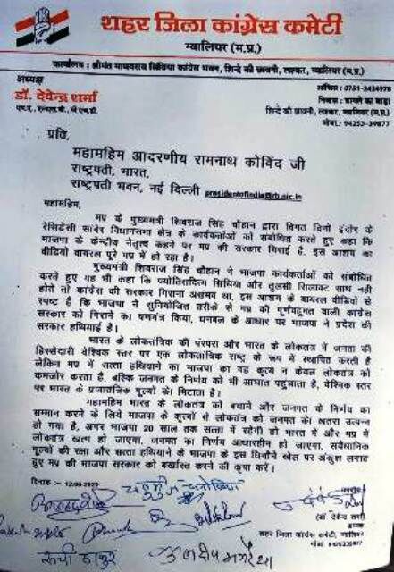 कांग्रेस का आरोप है कि शिवराज सिंह चौहान ने केंद्रीय नेतृत्व के इशारे पर षडयंत्र पूर्वक प्रदेश की कमलनाथ सरकार को अपदस्थ कर धन-बल के आधार अपनी सरकार बनाई है।ज्ञापन में लिखा है की विगत दिनों प्रदेश के मुख्यमंत्री शिवराज सिंह ने इंदौर में सांवेर विधानसभा क्षेत्र के कार्यकर्ताओं को संबोधित करते हुए कहा की केंद्रीय नेतृत्व के कहने पर कमलनाथ सरकार को गिराने की बात कही। साथ ही उन्होंने कहा था की ज्योतिरादित्य सिंधिया और तुलसीराम सिलावट के सहयोग के बिना सरकार गिराना संभव नहीं था। इसके अलावा कांग्रेस ने आरोप लगाया है की भारतीय जनता पार्टी का यह कृत्य ना सर्फ लोकतंत्र को कमजोर करता है, बल्कि जनमत के निर्णय को भी आघात पहुंचाता है। इससे लोकतंत्र को खतरा हो गया है।