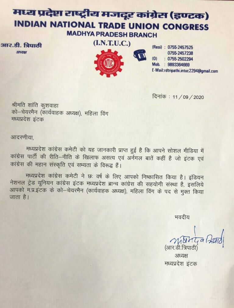 इंटक की कार्यवाहक अध्यक्ष शांति कुशवाहा हुई कांग्रेस से निष्कासित