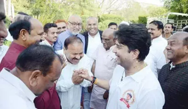 केन्द्रीय मंत्री ज्योतिरादित्य सिंधिया के सामने हाथ जोड़े दिखे कांग्रेसी