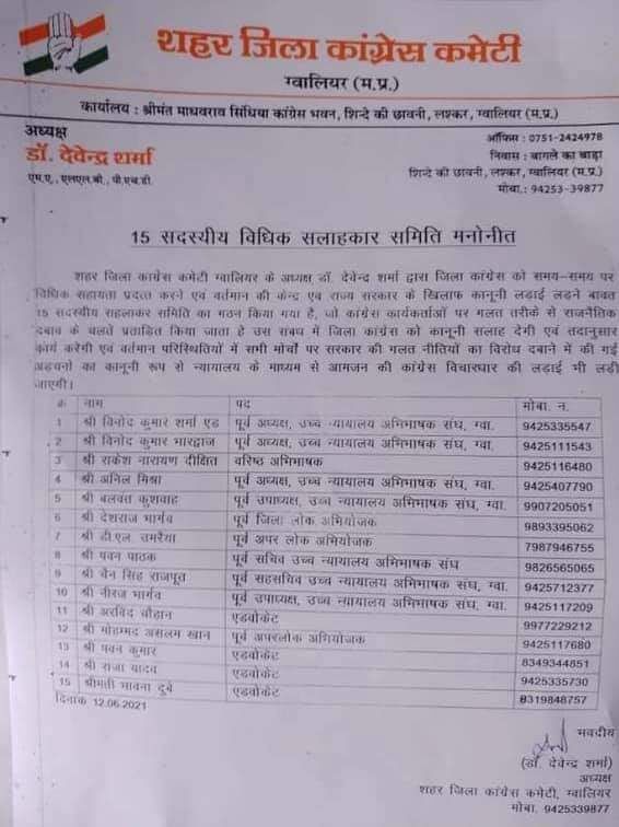 ग्वालियर। शहर जिला कांग्रेस कमेटी ने विधिक सहायता प्रदान करने एवं कानूनी विवादों को लड़ने के लिए 15 सदस्यीय विधिक सलाहकार समिति का गठन किया है। ये समिति समय - समय पर कांग्रेस नेताओं को विधिक सहायता एवं सलाह देगी।