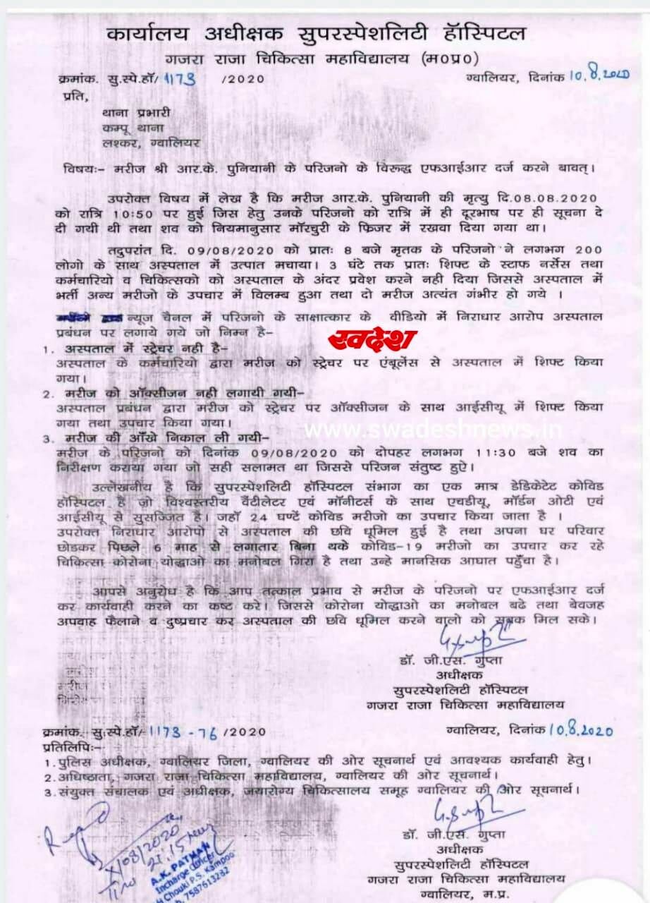 |ग्वालियर। जयारोग्य समूह के सुपर स्पेशलिटी अस्पताल में भर्ती कोरोना मरीज आरके पुनियानी की मौत के बाद परिजंनों ने रविवार को हंगामा किया था। परिजनों ने अस्पताल प्रबंधन पर लापरवाही एवं मरीज की आँख निकाल लेने का आरोप लगाया था। जिसके बाद प्रशासन ने शव का परिक्षण करा अंतिम संस्कार कर दिया गया था। अब अस्पताल प्रबंधन ने मरीज के परिजनों के खिलाफ एफआईआर कराने की मांग की है। अस्पताल प्रबंधन का आरोप है की परिजनों ने चिकित्स्कों एवं अस्पताल प्रबंधन पर झूठे आरोप लगाए एवं हंगामा कर मरीजों के इलाज में बाधा डाली है।