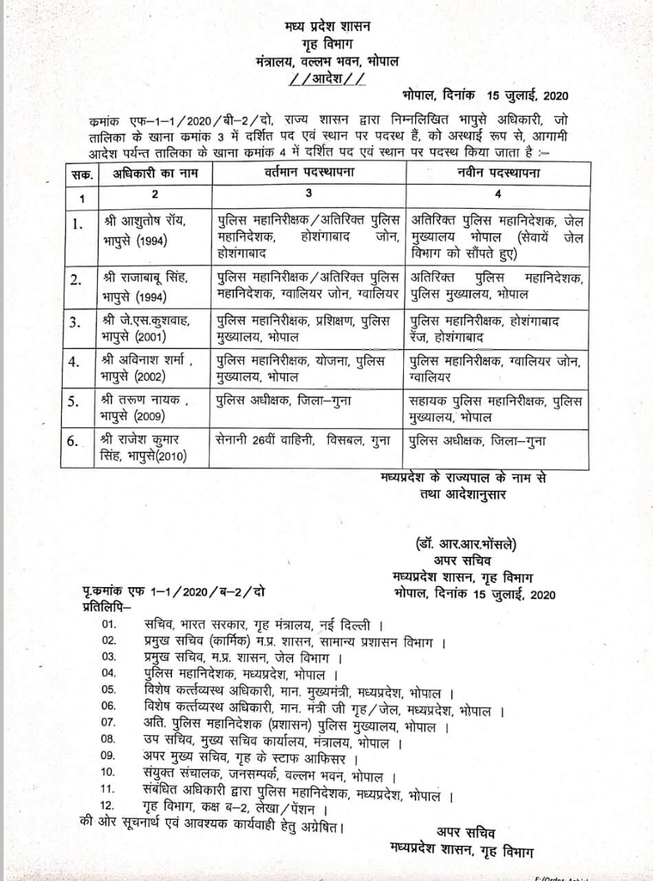 देर रात जारी हुई सूची में गुना एसपी तरुण नायक को भी अशोकनगर कथित जमीन विवाद के चलते हटाया दिया गया है। उनके स्थान पर 2010 बैच के IPS राजेश कुमार सिंह को गुना एसपी नियुक्त किया है।