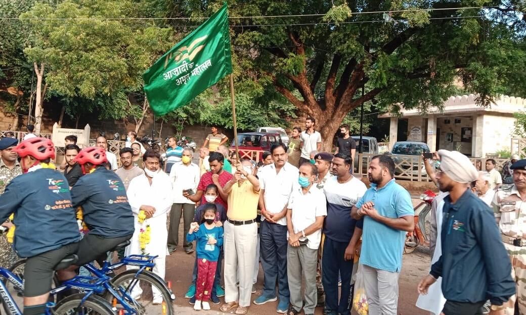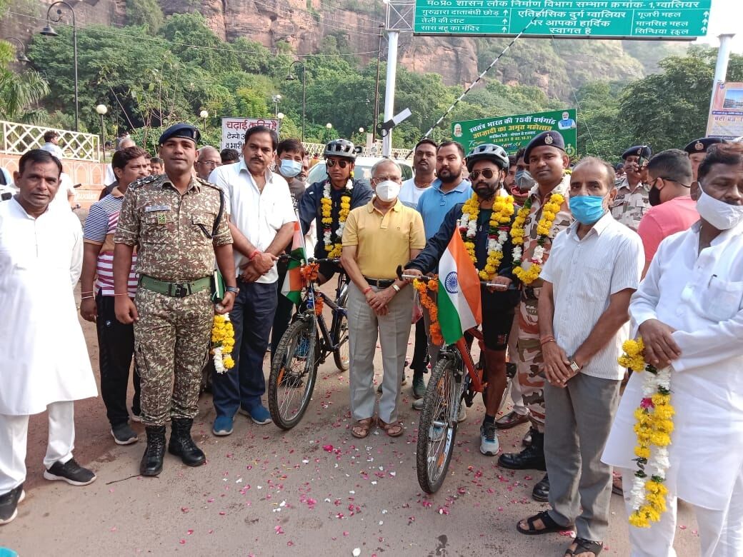 |ग्वालियर। ग्वालियर सांसद विवेक नारायण शेजवलकर ने आज ग्वालियर किले से आजादी के 75 वर्षगांठ अमृत महोत्सव के तहत इंडियन तिब्बत सीमा पुलिस बल के जवानों को साइकिल रैली के लिए हरी झंडी दिखाकर राजघाट के लिए रवाना किया। जिसमें सेना के लेफ्टिनेंट कर्नल एवं वरिष्ठ अधिकारी उपस्थित रहे।