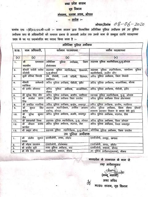 ग्वालियर। प्रदेश में कोरोना महामारी के बीच प्रशासनिक फेरबदल का दौर लगातार जारी है। गृह मंत्रालय ने आज बड़े स्तर पर अतिरिक्त पुलिस अधीक्षक और उप पुलिस अधीक्षकों के तबादले किये है। जिले में अतिरिक्त पुलिस अधीक्षक ग्रामीण का दायित्व निभा रहें सुरेंद्र सिंह गौर को सहायक पुलिस महानिरीक्षक कार्यालय भोपाल में नई पदस्थापना की गई है। उनके स्थान पर रायसिंह नरवारिया उनका दायित्व संभालेंगे। नरवरिया वर्तमान में जबलपुर क्राइम ब्रांच में पदस्थ थे। इसके अलावा 14 वीं बटालियन विसबल में पदस्थ सुश्री प्रतिभा त्रिपाठी को अतिरिक्त पुलिस अधीक्षक निवाड़ी की नई जिम्मेदारी सौपी गई है। अन्य तबादलों के लिए देखें लिस्ट...