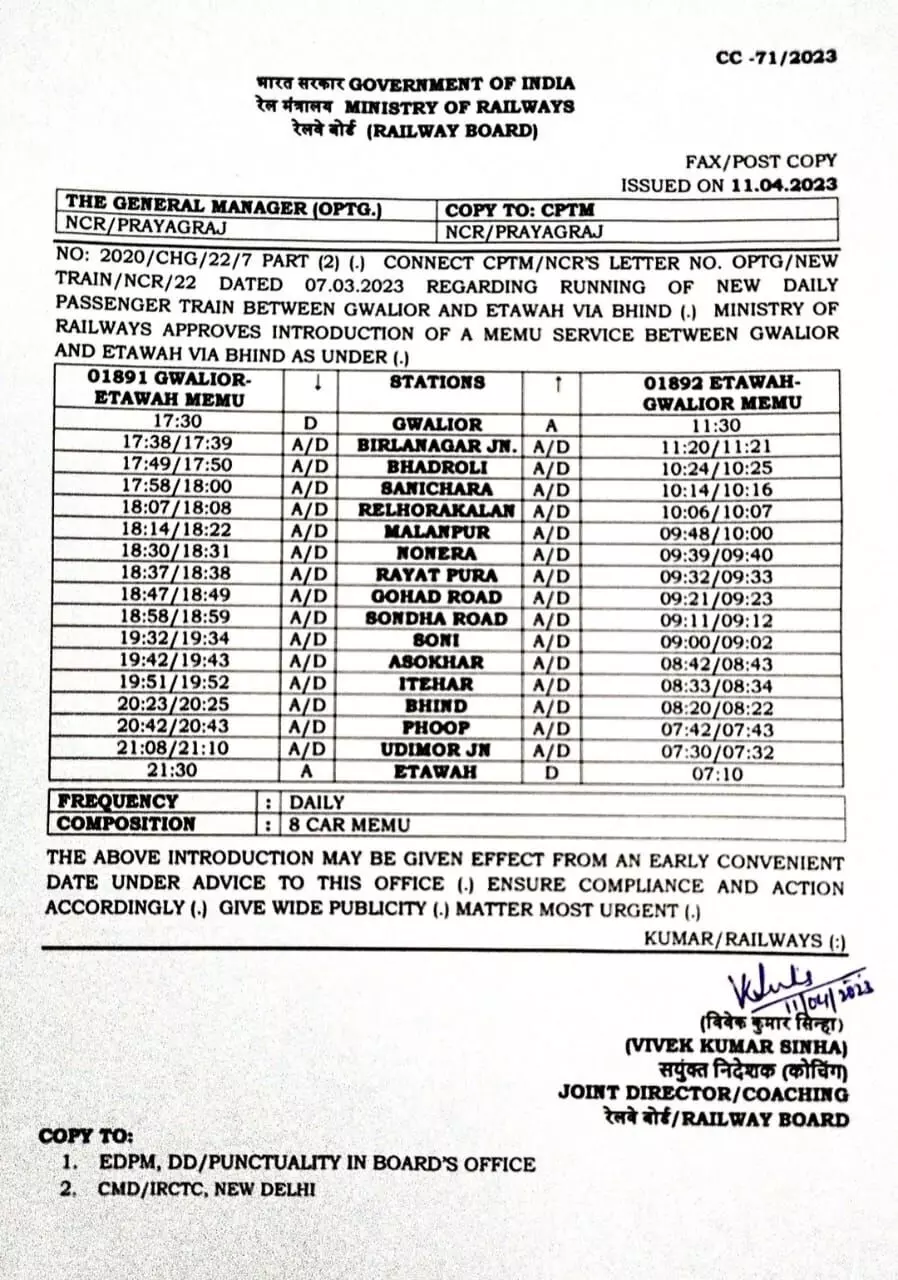 ग्वालियर से इटावा के बीच जल्द चलेगी मेमू ट्रेन, रेलवे ने जारी किया शेड्यूल