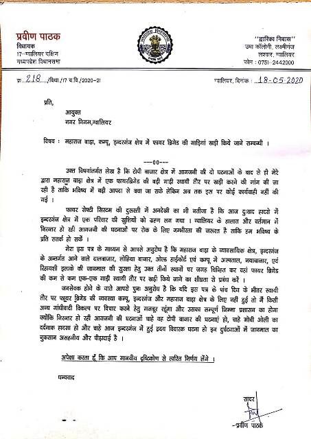 विधायक ने आगे लिखा की यदि इस पत्र के 5 दिन के भीतर स्थाई तौर पर फायर ब्रिगेड की व्यवस्था कंपू, इंदरगंज और महाराज बाड़ा क्षेत्र के लिए नहीं हुई तो मैं किसी अन्य गांधीवादी विकल्प पर विचार करने हेतु मजबूर रहूंगा और उसका संपूर्ण जिम्मा प्रशासन का होगा। उन्होंने कहा की शहर में हो रही आगजनी की घटनाओं में जानमाल का नुकसान असहनीय और पीड़ा दाई है।