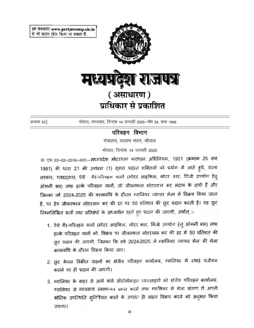 |Gwalior Trade Fair 2025 : मध्यप्रदेश के ग्वालियर में चल रहे व्यापार मेले के दौरान अब गाड़ी खरीदने पर रोड टैक्स में 50 प्रतिशत की छूट मिलेगी। यह आदेश मंगलवार को मध्यप्रदेश परिवहन विभाग द्वारा जारी किया गया। 20 दिन पहले शुरू हुए इस व्यापार मेले में, पहले टैक्स में छूट नहीं दी जा रही थी, जिसके बाद लगातार इस छूट की मांग की जा रही थी। अब इसे ध्यान में रखते हुए, सरकार ने रोड टैक्स में छूट देने का फैसला लिया है।