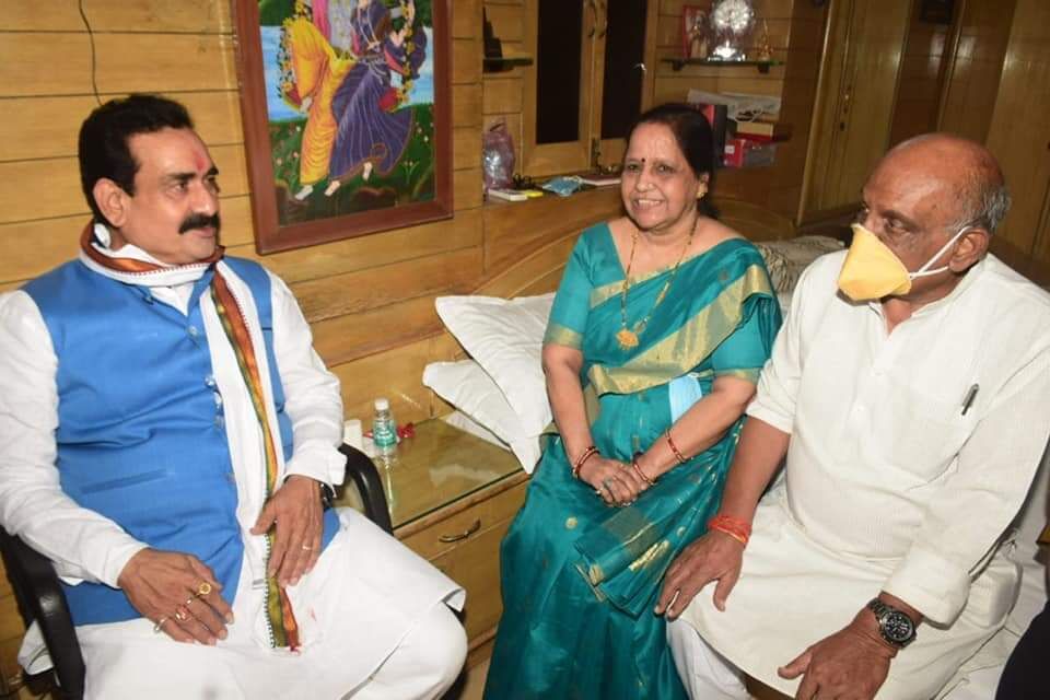 |ग्वालियर। प्रदेश के गृह मंत्री डॉ नरोत्तम मिश्रा रविवार को रात ग्वालियर आए। उन्होंने भाजपा नेता प्रीतम लोधी के जलालपुर स्थित निवास पहुंचकर उनसे मुलाकात की। इसके बाद पाटणकर बाजार स्थित पूर्व विधायक रमेश अग्रवाल के निवास पहुंचे। यहां श्री अग्रवाल ने अपनी पत्नी श्रीमती आशा अग्रवाल एवं पुत्री के साथ उनका स्वागत किया। इस अवसर पर सांसद विवेक शेजवलकर, भाजपा महानगर अध्यक्ष कमल माखीजानी, चेंबर के पूर्व अध्यक्ष गोविंद दास अग्रवाल, किशन मुदगल, रामनारायण मिश्रा, उमाशंकर सोनी, रुचिका श्रीवास्तव आदि मौजूद रहे। वहीं वरिष्ठ नेता डॉ केशव पांडे ने अपनी पुस्तक श्री मिश्रा को भेंट की।
