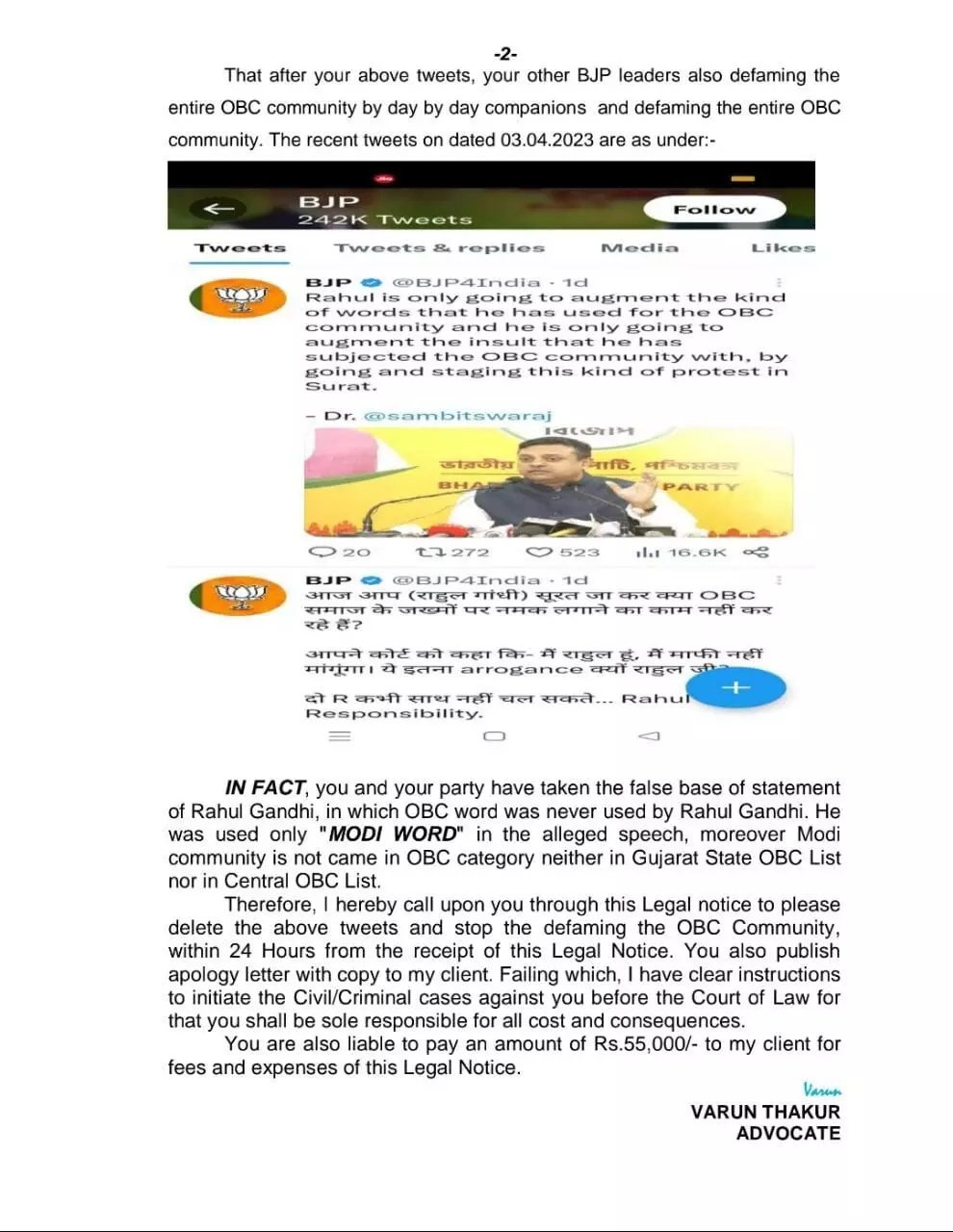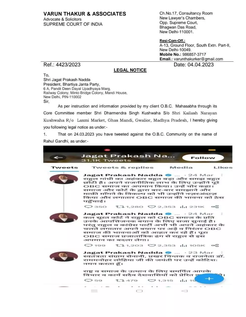 नड्डा के इसी ट्वीट को आधार मानकर अब ओबीसी महासभा नड्डा पर हमलावर हो गई है। ओबीसी महासभा द्वारा भाजपा अध्यक्ष को भेजे गए नोटिस में कहा गया है कि यदि जेपी नड्डा 7 दिन के अंदर ओबीसी समाज से माफी नहीं मांगते हैं, तो उनके खिलाफ कोर्ट में मानहानि का मुकदमा दायर किया जाएगा।