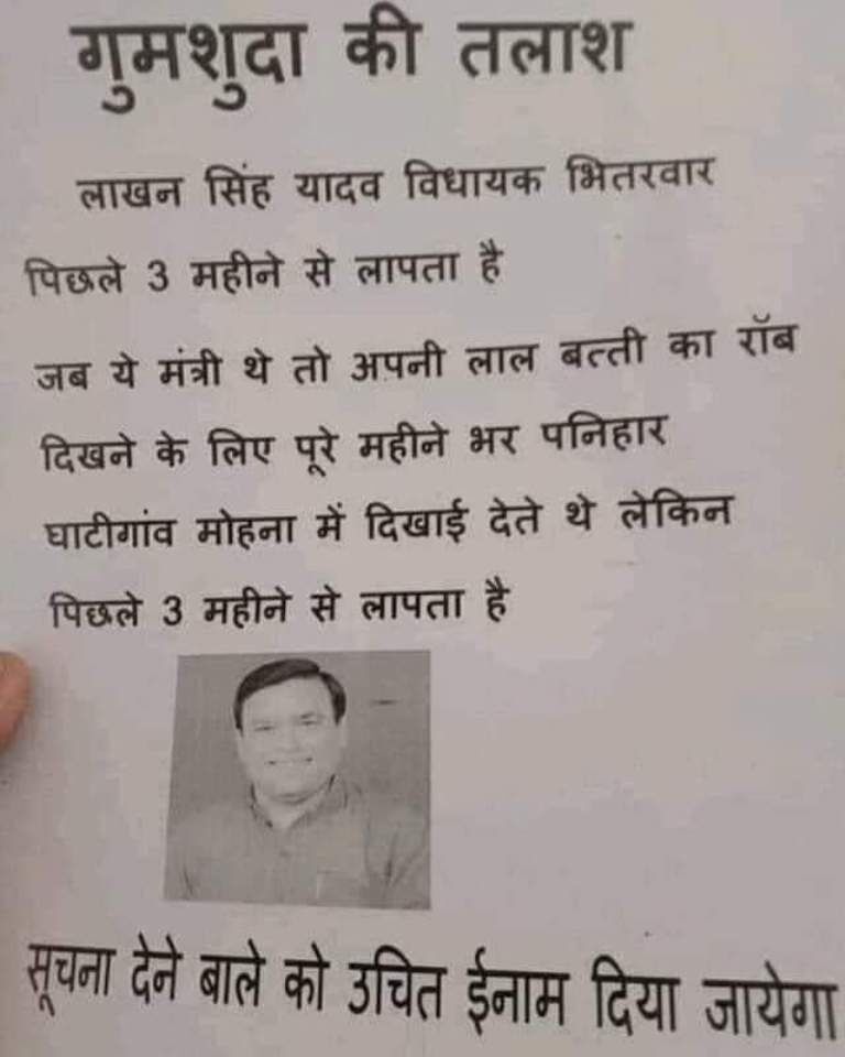 |ग्वालियर। जिले की भितरवार विधानसभा से कांग्रेस विधायक और गत कमलनाथ सरकार में मंत्री रहे लाखन सिंह की गुमशुदगी के पर्चे सोशल मीडिया पर पर्चे वायरल हो रहे हैं। पूर्व मंत्री क क्षेत्रवासी उन्हें फेसबुक एवं अन्य सोशल मीडिया प्लेटफॉर्म्स पर पर्चे चस्पा कर तलाश रहे है। मोहना, घाटीगांव व पनिहार के कुछ लोगों ने सोशल मीडिया प्लेटफॉर्म्स पर यहां तक लिख दिया की महीने से विधायक गुमशुदा हैं। यदि कोई उनकी खबर देता है तो उसे उचित इनाम दिया जाएगा। पूर्व मंत्री के गुमशुदा होने की पोस्ट जमकर वायरल हो रही है।