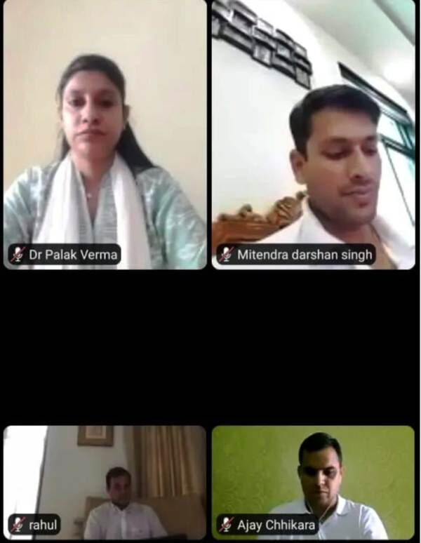 कांग्रेस नेता राहुल गांधी ने आज जूम एप के माध्यम वीडियो कॉंफ़्रेंस पर से राहुल गांधी ने ऑल इंडिया यूथ कांग्रेस के पदाधिकारियों से बात की।इस बैठक में युवा नेताओं को भी शामिल किया गया है। जिसमें ग्वालियर से युवा नेता मितेंद्र दर्शन सिंह को भी शामिल किया गया। इस मीटिंग के दौरान राहुल गांधी ने कहा की हम सबको मिलकर आगे पार्टी की लड़ाई लड़नी है। मीटिंग में शामिल युवा नेता मितेंद्र सिंह ने राहुल गाँधी को विश्वास दिलाया की विचारधारा की इस लड़ाई में ग्वालियर- चंबल संभाग का हर युवा कांग्रेस पार्टी के साथ खड़ा हुआ है।
