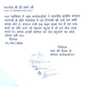 जानकारी के मुताबिक मंगलवार को सिटी सेंटर के एक होटल में कुछ नेताओं की एक बैठक हुई। जिसमें निवर्तमान अध्यक्ष देवेश शर्मा, पूर्व साडा अध्यक्ष राकेश जादौन, पूर्व जीडीए अध्यक्ष अभय चौधरी, पूर्व सभापति बृजेंद्र सिंह जादौन लालजी, पूर्व मेला उपाध्यक्ष वेदप्रकाश शिवहरे और सहकारी विपणन निगम के पूर्व अध्यक्ष अरुण सिंह तोमर शामिल रहे। बैठक में इस बात पर खेद जताया गया कि सोमवार को मंगल वाटिका में आयोजित बैठक में संगठन महामंत्री के प्रति भावावेश में टिप्पणी की गई थीं। आज उसे वापस लेते हुए कहा गया कि यह पद श्रद्धा का है, उन्हें इसके लिए जो आघात लगा है, उसके लिए हम खेद व्यक्त करते हैं। माफीनामे का यह पत्र मंगलवार की रात प्रदेश भाजपा मीडिया से जारी हुआ ।