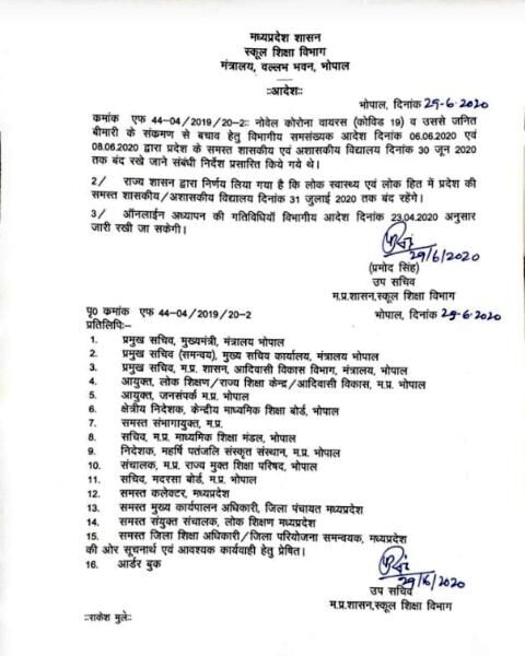 बता दें की प्रदेश में कोरोना संक्रमण के बढ़ते प्रसार के बाद से अभिभावकों द्वारा स्कूलों को बंद रखने की लगातार मांग उठ रहीं थी।बता दें की राज्य में कोरोना संक्रमण के प्रसार को रोकने के लिये 23 मार्च को घोषित हुए लॉकडाउन के बाद से ही सभी स्कूल, कॉलेज बंद है। बताया जा रहा है की सरकार स्कूल, कॉलेजों को खोलनें एवं शिक्षा व्यवस्था को बहाल करने के लिएजल्द ही नई गाइडलाइंस जारी कर सकती है। जिसके तहत 31 जुलाई के बाद शिक्षा व्यवस्था बहाल हो सकती है।