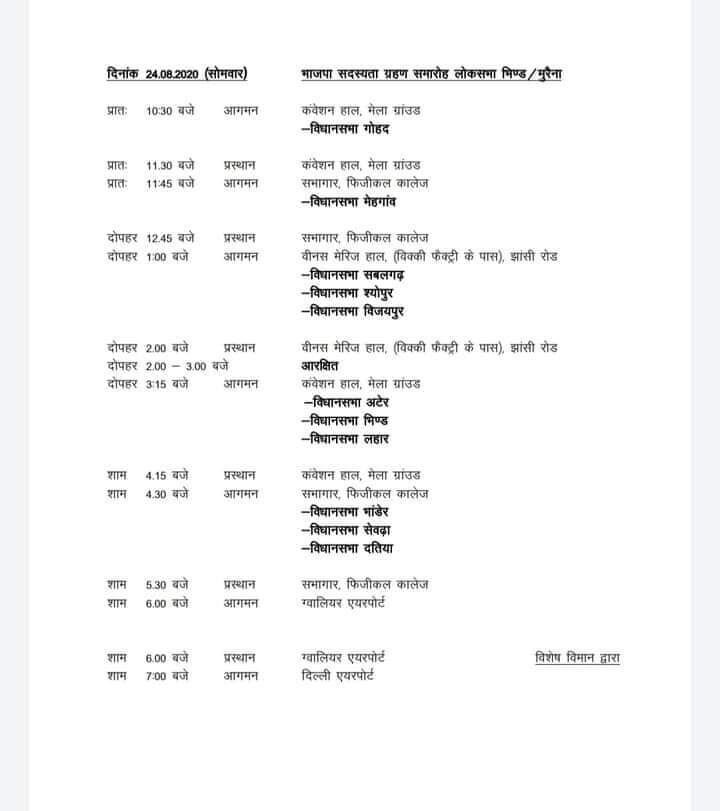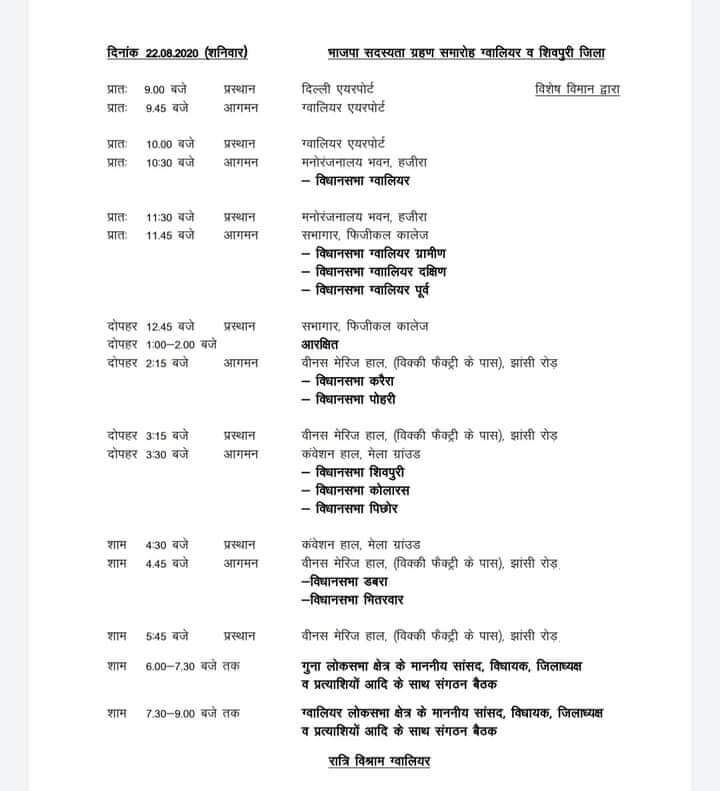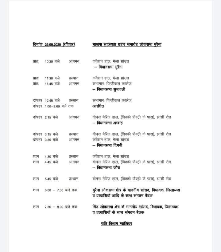 बताया जा रहा है की 22,23 और 24 अगस्त को जिले में बड़े स्तर पर भाजपा का सदस्यता अभियान चलेगा। जिसमें बड़ी संख्या में ग्वालियर - चंबल अंचल के हजारों कांग्रेस कार्यकर्ता भाजपा की सदस्यता लेंगे। इस अभियान के लिए ग्वालियर के फूलबाग मैदान पर एक कार्यक्रम का आयोजन किया जायेगा। जिसमें केंद्रीय मंत्री नरेंद्र सिंह तोमर, मुख्यमंत्री शिवराज सिंह चौहान, राज्यसभा सांसद ज्योतिरादित्य सिंधिया, भाजपा प्रदेश अध्यक्ष वीडी शर्मा एवं भाजपा के अन्य वरिष्ठ नेता उपस्थित रहेंगे। ऊर्जा मंत्री प्रद्युम्न सिंह तोमर ने आज फूलबाग मैदान पहुंचकर कार्यक्रम का जायजा लिया। उनके साथ कलेक्टर कौशलेंद्र विक्रम सिंह, नगर निगम आयुक्त संदीप माकिन, एसपी अमित सांघी, एडीएम किशोर कन्याल सहित नगर निगम और जिला प्रशासन के कई अधिकारी मौजूद थे।