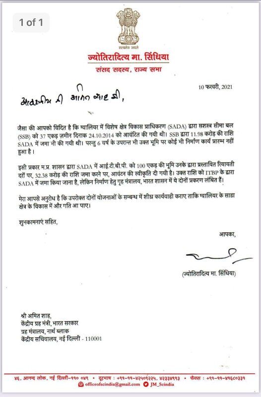 |ग्वालियर। राज्यसभा सांसद ज्योतिरादित्य सिंधिया ने केंद्रीय गृह मंत्री अमित शाह को पत्र लिखकर ग्वालियर के साडा क्षेत्र के विकास के लिए एसएसबी एवं आईटीबीपी के निर्माण कार्यों की योजनाओं को शीघ्र आरंभ करने का अनुरोध किया।