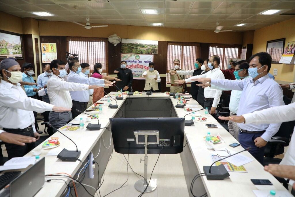 इस अवसर पर जिला पंचायत सीईओ शिवम वर्मा, अपर कलेक्टर किशोर कान्याल व आशीष तिवारी, स्मार्ट सिटी सीईओ जयति सिंह, मुख्य चिकित्सा एवं स्वास्थ्य अधिकारी डॉ. वीके गुप्ता तथा जिले के सभी एसडीएम सहित कलेक्ट्रेट स्थित सभी कार्यालयों के अधिकारी-कर्मचारी उपस्थित थे।