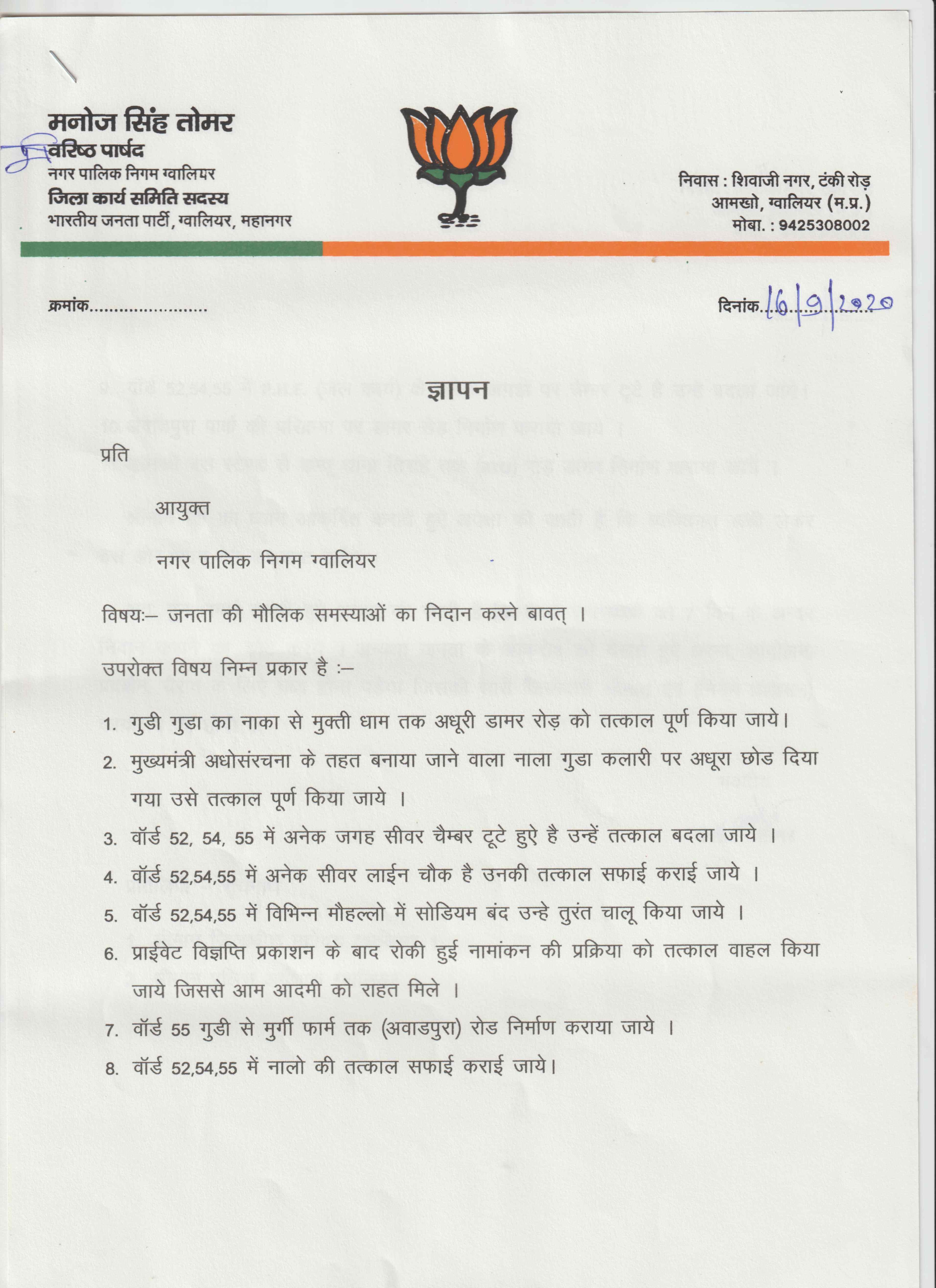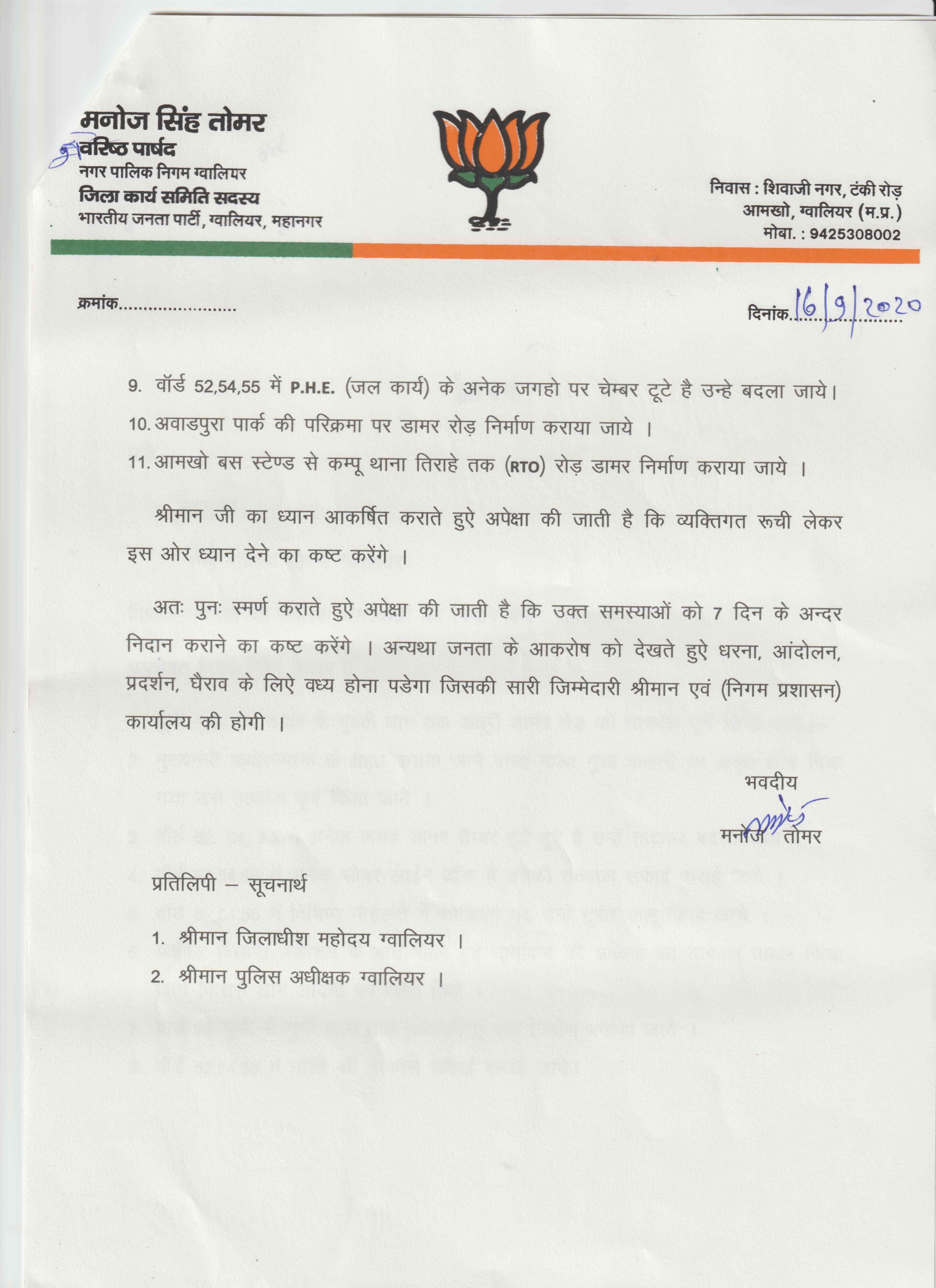 ग्वालियर। शहर के वार्ड क्रमांक 52, 54, 55 में विकास कार्य कराने के लिए पूर्व वरिष्ठ पार्षद एवं भाजपा नेता मनोज तोमर ने निगम आयुक्त को पत्र लिखा है। उन्होंने निगम आयुक्त को पत्र लिखकर क्षेत्र में फैली अवयवस्थाओं की ओर ध्यान आकर्षित करते हुए विकास कार्य कराने की मांग की है।साथ ही अगले सात दिनों में मांग पूरी ना होने पर धरना एवं प्रदर्शन करने की चेतावनी दी है।