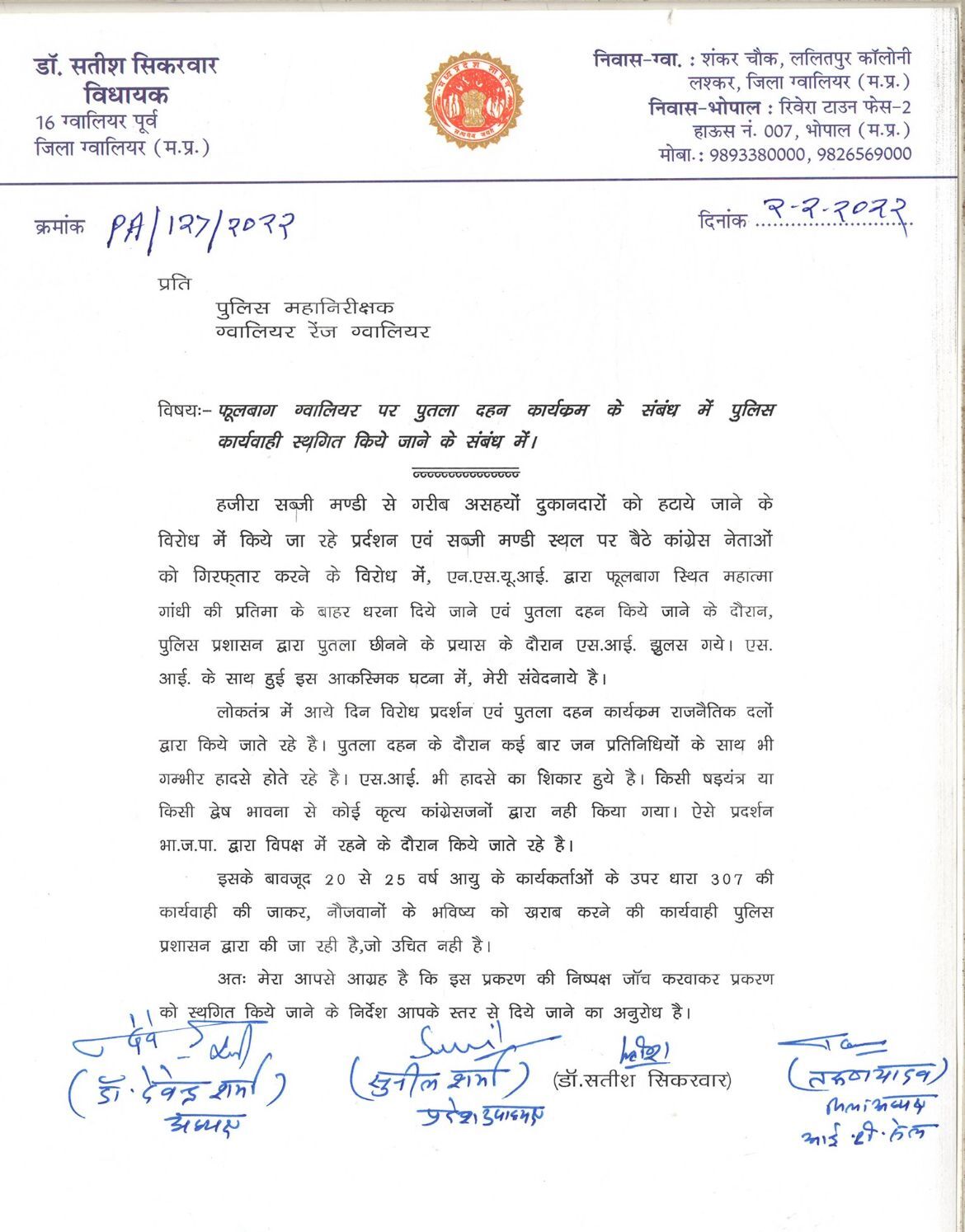 वहीँ कांग्रेस विधायक सतीश सिकरवार ने आईजी को पत्र लिखकर पुतला दहन मामले में कांग्रेस कार्यकर्ताओं पर हुई कार्रवाई को स्थगित करने की मांग की है। विधायक सिकरवार का कहना है की लोकतंत्र में राजनैतीक दलों द्वारा विरोध प्रदर्शन एवं पुतला दहन आए दिन किए जाते है। इस दौरान कई बार जनप्र्रतिनिधियों के साथ भी हादसे हो जाते है। ऐसे ही सब इंस्पेक्टर दीपक गौतम भी हादसे का शिकार हो गए। किसी षड्यंत्र या द्वेष भावना से कांग्रेस नेताओं द्वारा कोई कार्य नहीं किया गया है। ऐसे प्रदर्शन भाजपा नेताओं द्वारा भी विपक्ष में रहने के दौरान किए गए है।