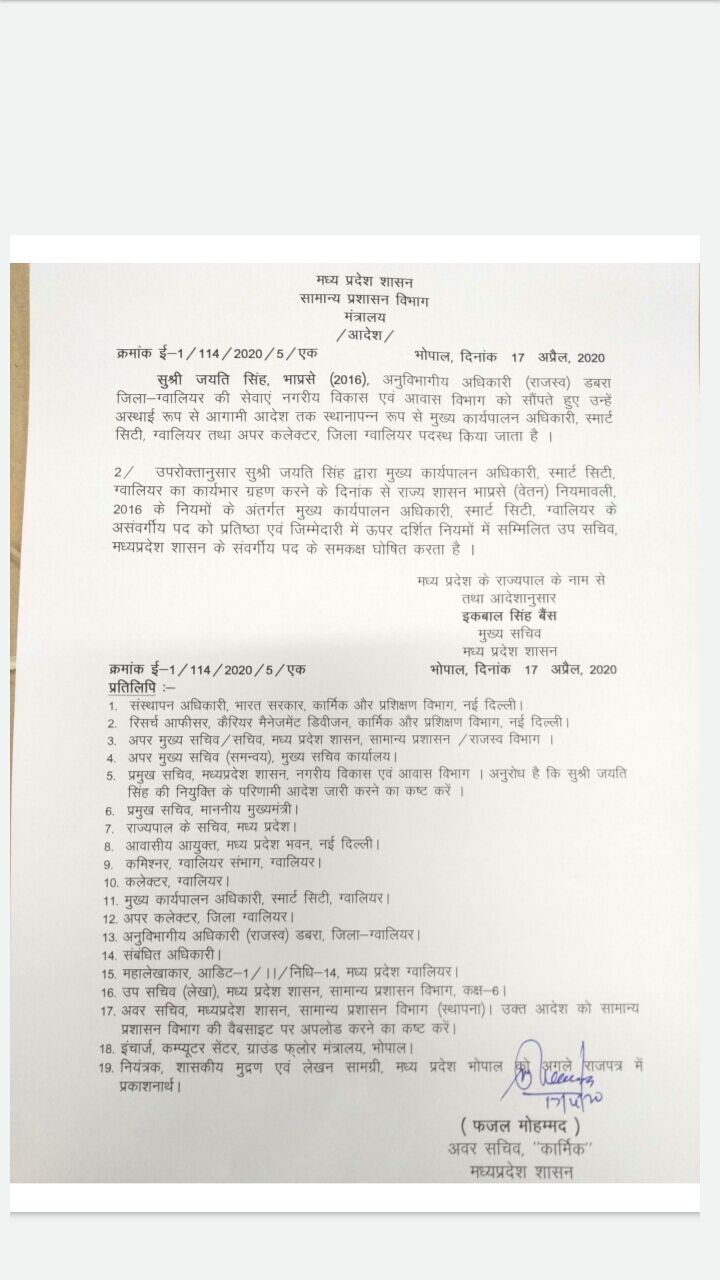 ग्वालियर। प्रदेश में कोरोना संकट के बीच आज सरकार ने बड़ा फैसला लेते हुए प्रशासनिक फेरबदल कर दिया है। प्रशासनिक फेरबदल करते हुए सरकार ने ग्वालियर स्मार्ट सिटी के सीईओ महिप तेजस्वी को हटाकर जयति सिंह को यह जिम्मेदारी सौपी है। जयति सिंह वर्तमान में अनुविभागीय अधिकारी राजस्व डबरा-ग्वालियर के पद पदस्थ थे।उन्हें स्मार्ट सिटी ग्वालियर के साथ ग्वालियर का अपर कलेक्टर भी नियुक्त किया है।