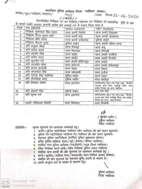 ग्वालियर। शहर में उपनिरीक्षकों के आज थोकबंद ट्रांसफर किये गए है। देहात एवं शहरी सहित कई थानों के उपनिरीक्षकों को बदल दिया गया है। कृष्णपालसिंह यादव को थाना सिरोल से थाना भितरवार, विनय शर्मा को कम्पू से जनकगंज ,शत्रुघ्न मिश्रा थाना गिरवाई से थाना कम्पू आदि के ट्रांसफर किये गए है। सभी के नाम जान्ने के लिए लिस्ट देखें। transfrt