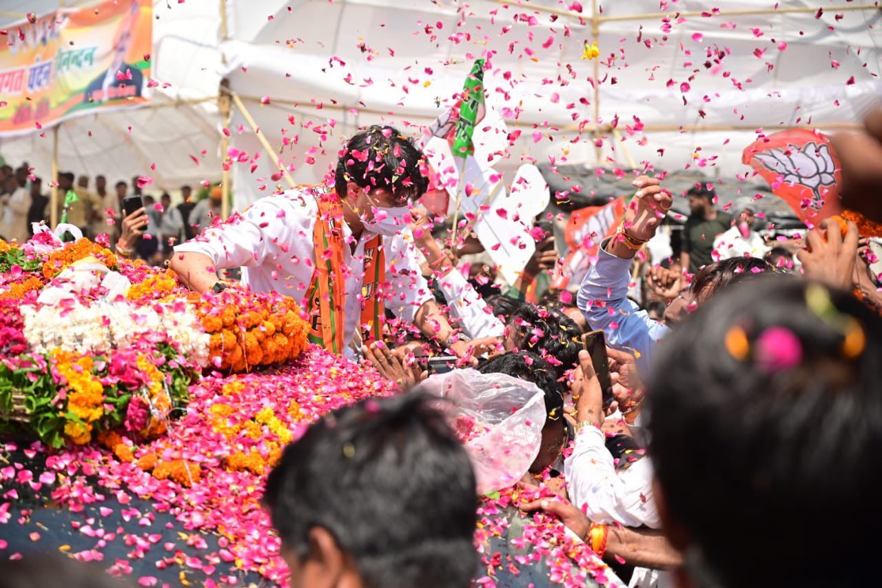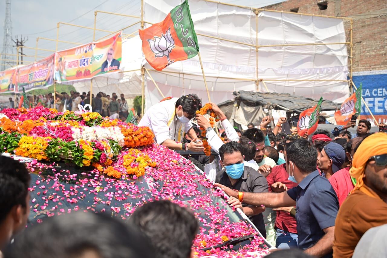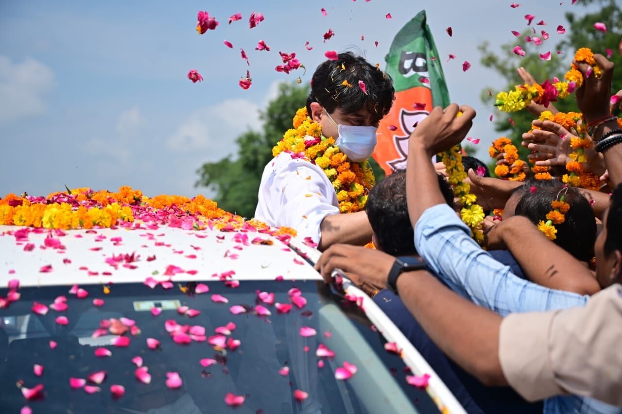 सिंधिया को शॉल-श्रीफल, पुष्पहार प्रदान कर स्वागत अभिनंदन करते हुये फूलों की वर्षा शुरू कर दी। जैसे-जैसे ज्योतिरादित्य सिंधिया का काफिला आगे बढ़ता गया वैसे-वैसे जगह जगह उनका ऐतिहासिक एवं भव्य स्वागत उनके समर्थकों ने किया। अल्लाह बेली चौकी के बाद भाजपा कार्यकर्ताओं ने बाबा देवपुरी मंदिर पर केन्द्रीय मंत्रीद्वय ज्योतिरादित्य सिंधिया व नरेन्द्र सिंह तोमर का स्वागत किया।