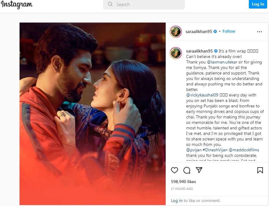 सारा लिखती हैं कि मुझे सौम्या का किरदार देने के लिए लक्ष्मण उटेकर का बहुत धन्यवाद है। विक्की कौशल के साथ रोज पंजाबी गाने, अल सुबह बोन फायर्स और चाय की चुस्कियां हमेशा याद रहेंगी। मप्र के प्राकृतिक सौंदर्य की रह-रह कर याद आ रही है। वहीं, विक्की कौशल ने पूरी यूनिट को शुक्रिया कहते हुए लिखा है कि बात ये दिल की है, जो घर-घर तक पहुंचेगी... या शायद बात घर की है जो हर दिल को छूएगी। सी यू ऑल सून एट द मूवीज...विक्की ने भी इंदौरवासियों को दिल से शुक्रिया कहा है ।