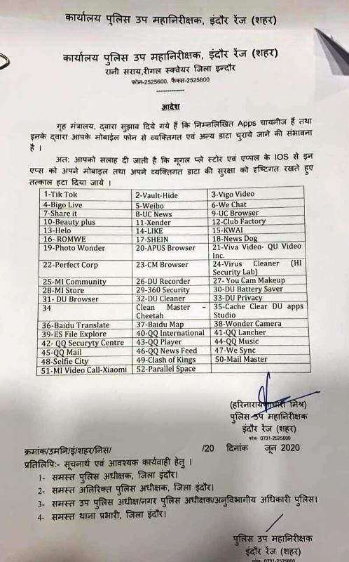 |इंदौर। लद्दाख की गलवान घाटी में भारतीय सेना की चीनी सेना से हुई हिसंक झड़प में 20 भारतीय जवान शहीद हो गए थे। शांति वार्ता की आड़ में चीन द्वारा की गई इस हरकत से पूरे देश में चीन के प्रति लोगों में गुस्सा है। देश भर में आमजनों द्वारा चीनी सामन का बहिष्कार किया जा रहा है। भारत में प्रचलित चीनी मोबाइल एप्स द्वारा डाटा चोरी करने की जानकारी भी सामने आ रही है। इसी के चलते इंदौर डीआईजी हरिनारायणचारी मिश्र ने इन चीनी एप्स को मोबाइल से डिलीट करने का आदेश दिया है। उन्होंने अपने कर्मचारियों को आदेश जारी कर प्रचलित 52 एप्स को तत्काल डिलीट करने का आदेश दिया है।