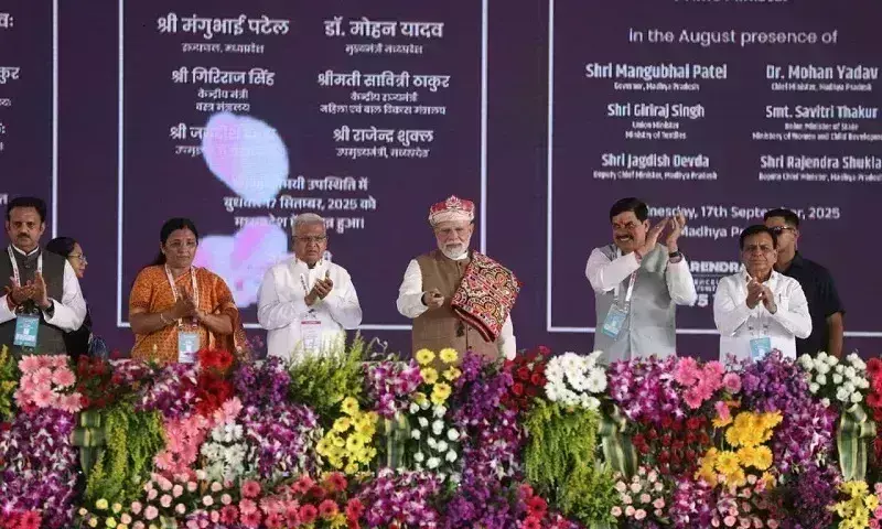 |इंदौर। प्रधानमंत्री नरेन्द्र मोदी ने बुधवार को अपने जन्मदिन के अवसर पर मध्य प्रदेश के धार जिले के भैंसोला गांव में देश के पहले पीएम मित्र पार्क का शिलान्यास किया। इसके साथ ही उन्होंने सिंगल क्लिक के माध्यम से स्वस्थ नारी, सशक्त परिवार एवं पोषण अभियान का शुभारंभ और सुमन सखी चैटबाट का लोकार्पण किया। इस दौरान उन्होंने नागरिकों को स्वदेशी अपनाने का मंत्र दिया।