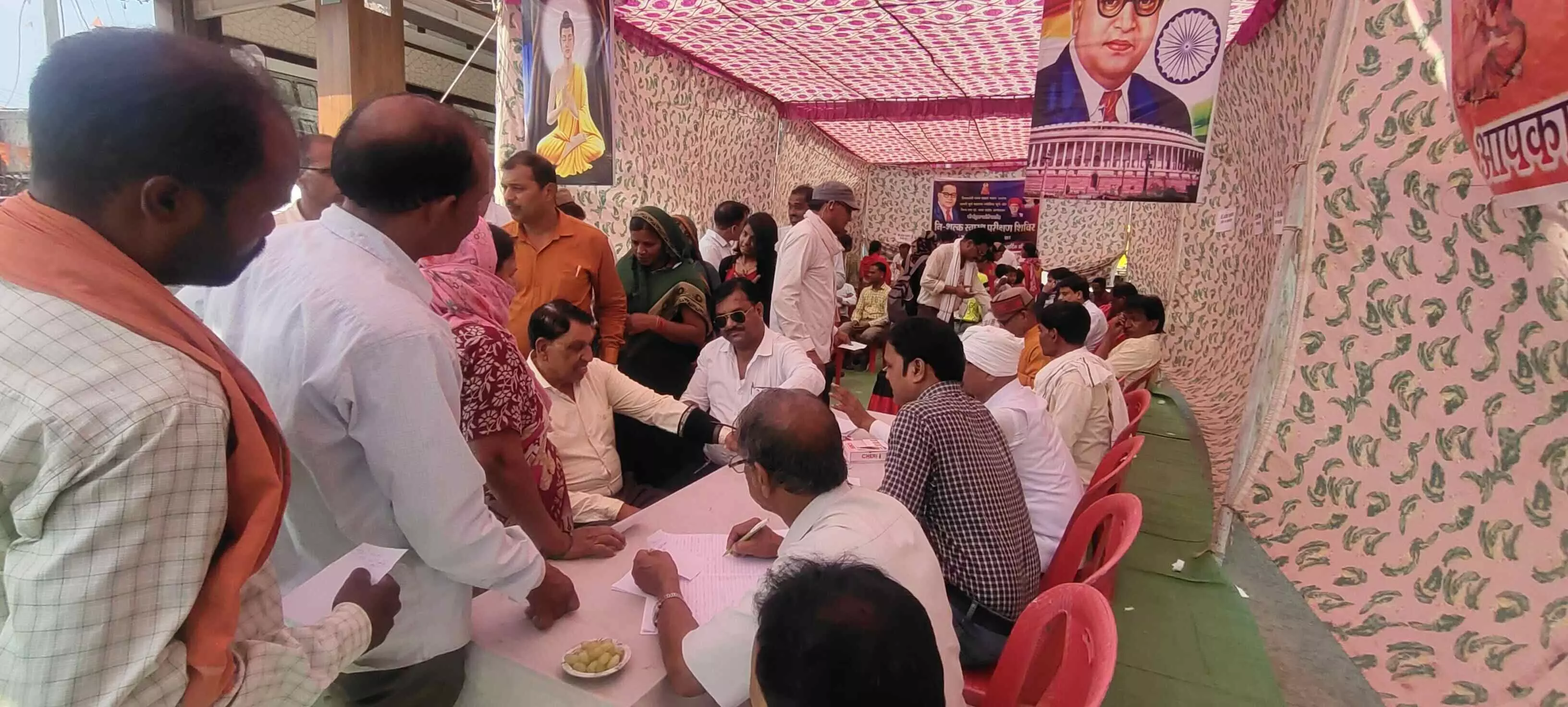|आमला। आमला नगर की करुणा बौद्ध विहार समिति भीमनगर आमला के तत्वाधान मे 12अप्रैल2023 दिन बुधवार को समय दोपहर 1 बजे से शाम 5 बजे तक नगर पालिका स्कूल, जनपद चौक के पास निशुल्क स्वास्थ्य परीक्षण शिविर का आयोजन किया गया था। इस शिविर मे स्पेशलिस्ट डॉक्टर्स ने अपनी निशुल्क सेवाए दी डॉ. नितेश चौकीकर एमबीबीएस एमएस जनरल सर्जन बैतुल, डॉ. संगीता पवांर एमबीबीएस स्त्रीरोग विशेषज्ञ आमला, डॉ. दीपक वाईकर बीडीएस दंतरोग विशेषज्ञ, डॉ. दिलीप चौकीकर बीएचएमएस, डॉ. सुनिल पुण्डे डीएचईएमएस, डॉ. कविता बिजवे बीएचएमएस विशेष आमला, सुशील मसतकर फार्मासिस्ट द्वारा शुगर, बी.पी. एवं अन्य बीमारियों की जांच कर निशुल्क दवाईयों का वितरण किया गया। शिवप्रसाद गुजरे ने बताया की शिविर के माध्यम से लगभग साढे तीन सैकडा लोगो को उक्त बीमारियों की निशुल्क जांच कर निशुल्क दवाईया दी गई। इस शिविर की व्यवस्था को बनाने मे समिति के सदस्य कृष्णा बोरकर, गणपती उबनारे, प्रभाकर उबनारे, राजू चौकीकर, कपिल निरापुरे, मनीष झरबड़े,क्षअजय गुजरे, पंकज पाटिल आदि सदस्यों का महत्वपूर्ण योगदान रहा।