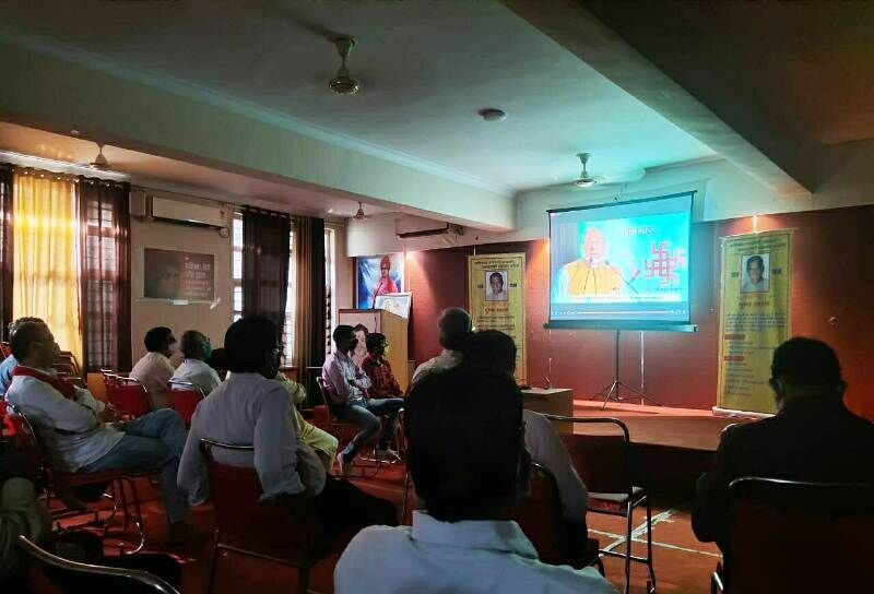 समारोह को लाइव प्रसारण के माध्यम से नई सड़क स्थित राष्ट्रोत्थान न्यास भवन के विवेकानंद सभागार में उपस्थित अतिथि जनों को बड़ी स्क्रीन पर दिखाया गया।