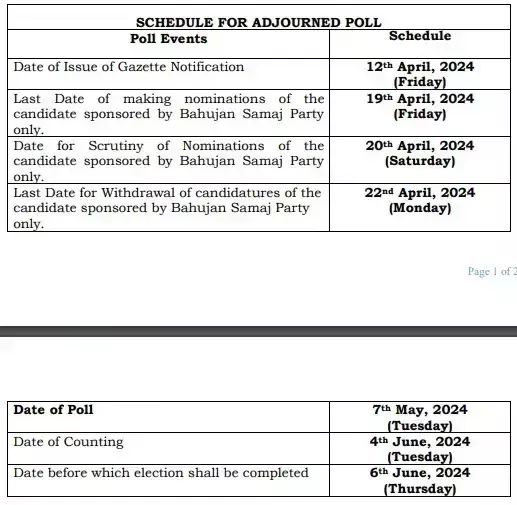 चुनाव आयोग ने आज सीट से जुड़ा नया मतदान कार्यक्रम जारी किया। कल बीएसपी नेता अशोक भलावी का दिल का दौरा पड़ने से निधन हो गया था। इसके बाद इस सीट पर चुनाव टाल दिया गया था।तीसरे चरण के तहत अब इस सीट पर 12 अप्रैल को अधिसूचना के बाद बहुजन समाज पार्टी को अपना उम्मीदवार खड़ा करने का अवसर दिया जाएगा। यह प्रक्रिया 22 अप्रैल तक पूरी की जाएगी। इसके बाद इस सीट पर 7 मई को तीसरे चरण में मतदान होगा।